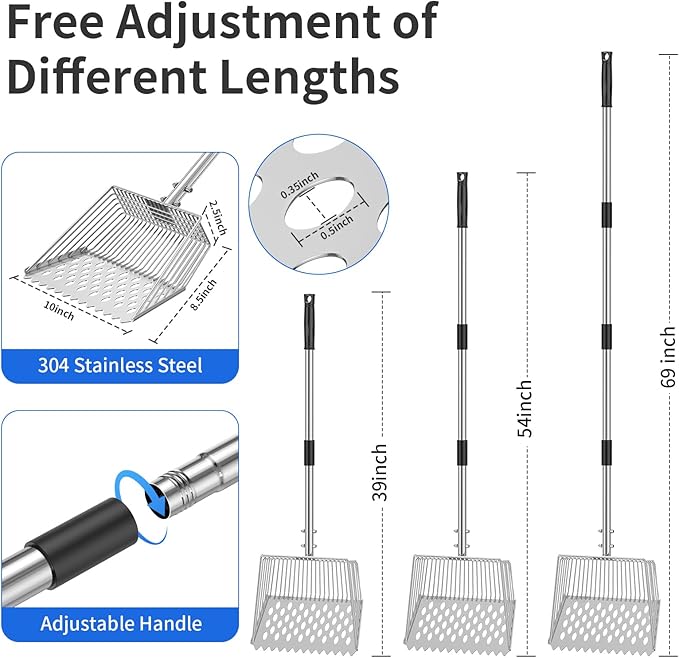 • Adjustable Handle: To meet the needs of different users, our Chicken Poop Scooper can be adjusted to 24 inches, 39 inches, 54 inches,and 69 inches. It is divided into four parts, connected by sturdy stainless steel screws, suitable for different heights and scenes.