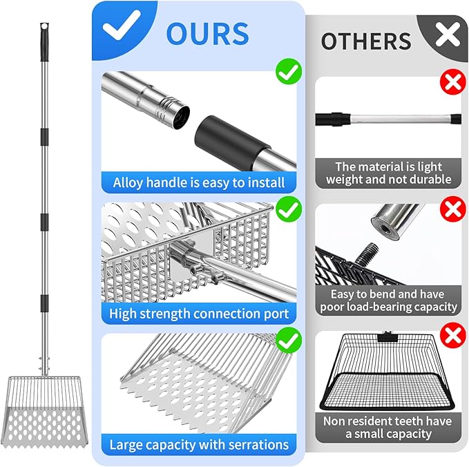 • Easy To Install and Clean: The shovel and handle are fixed and connected by anti loosening screws, and will not loosen after long-term use (please tighten all connections to the maximum extent before use). The design of the non stick garbage spoon can reduce feces sticking to the shovel, and only needs to be rinsed with water after use.