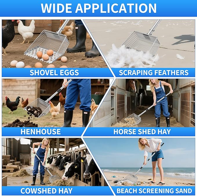 • Efficient Chicken Poop Scooper & Rake 2-in-1 — Patent Pending:Specially designed for farms, chicken coops, stables, and cowsheds, bidding farewell to the hassle of using multiple tools at the same time and achieving quick cleaning work with ease. Designed ergonomically to reduce pressure on the back, wrists, knees, and shoulders.