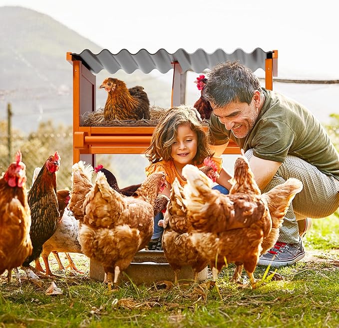 • 【Smart Slanted Roof Design】The smart angled roof design stops chickens from roosting on top, keeping the boxes clean. The protective overhang shelters nesting hens from rain, wind, and sun, creating a dry, comfortable, and private space for them to lay eggs.