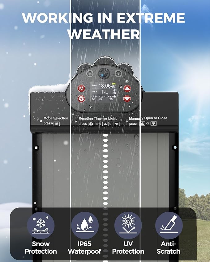 • 4 Versatile Operation Modes for Your Choice: Remote control via smartphone app, light-sensing (opens at dawn/closes at dusk), precise timer setting, or manual button press on the durable control panel—adapt to any situation for effortless management of your poultry’s access