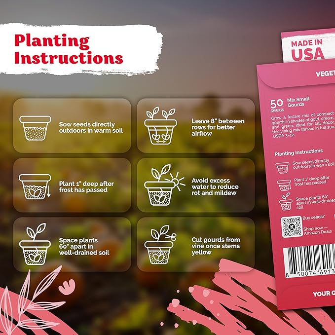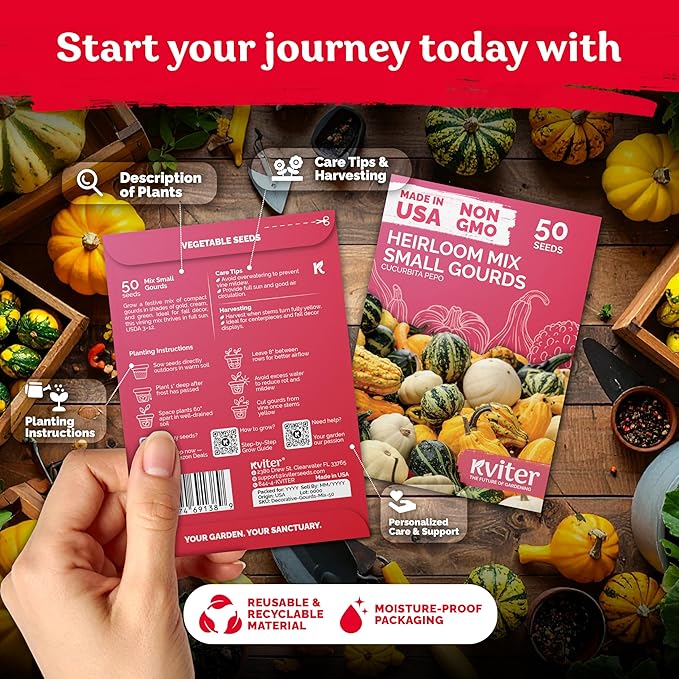 • Eco‑Friendly Décor: Grow mixed gourds, enjoy as gourds for decorating, then compost the shells—zero‑waste gardening. Garden seeds packets add charm to veggie seeds collections and gourd crafts.