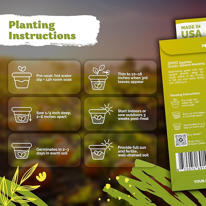 • Simple Planting Method: Briefly soak molokhiya seeds in hot water, then for 12 hours at room temp. Sow 1/4 inch deep in warm soil, an excellent choice among seeds for planting vegetables and fruits.