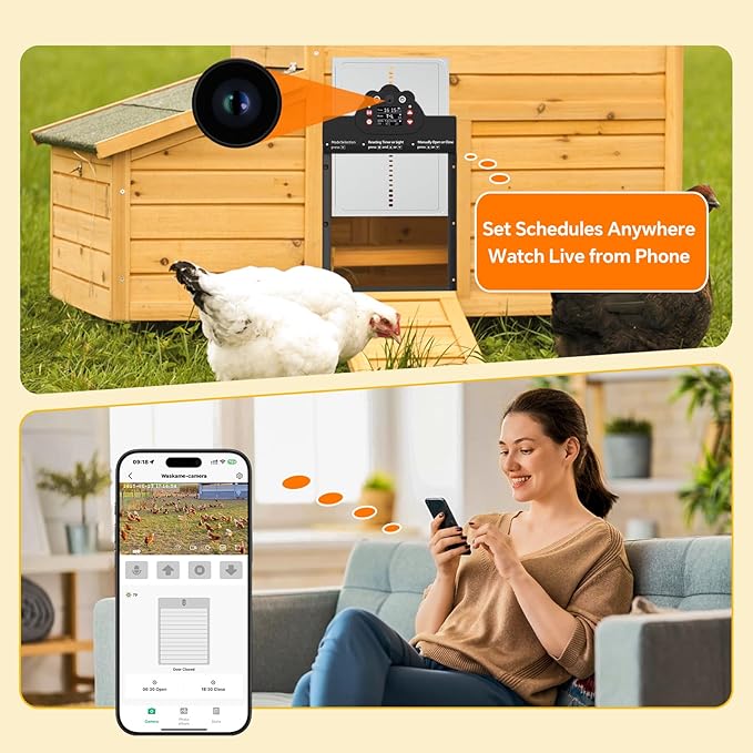• 【15-Minute Setup & Universal Fit】Install on wood/metal/plastic coops with included hardware. No tools needed—compatible with 2.4GHz Wi-Fi and free lifetime upgrades. Chew-proof aluminum housing protects chickens under 10 lbs. Lifetime support guaranteed.