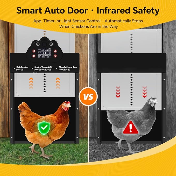 • 【Auto Door & Anti-Pinch Safety】Program door schedules via app (timer/light sensor) or manual control. Infrared sensors prevent accidents—door stops and reopens if chickens are detected. Built-in alarm scares away predators approaching at night.