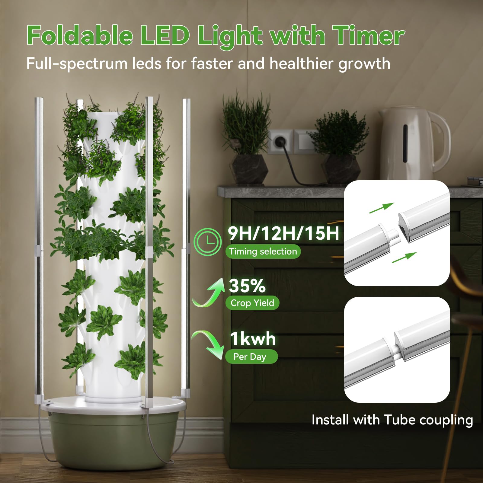 Foldable LED Light for Hydroponics Tower --- Can cover every plant tier. Adjust length freely, portable conveniently and storage easily. Also shut off with 3 timer settings (9h/12h/15h) for set-and-forget convenience. Mimic natural sunlight to promote faster, healthier growth for herbs, lettuce, peppers and more