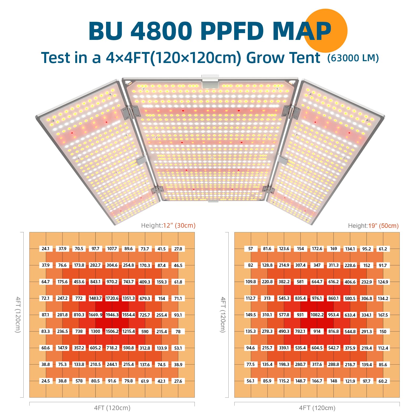 High Efficiency & Low Consumption: Barrina BU-4800 LED grow lights with high PPFD reaching to 3000µmol/m²/s, offers 63000lm while only consumes an actual 480 watts, running 50% less power than the HPS or other SMD LEDs or Blurple lamps. Veg coverage is 5x5 ft, Flowering coverage is 4x4 ft. Widely used indoors, such as grow tent, indoor garden and greenhouse