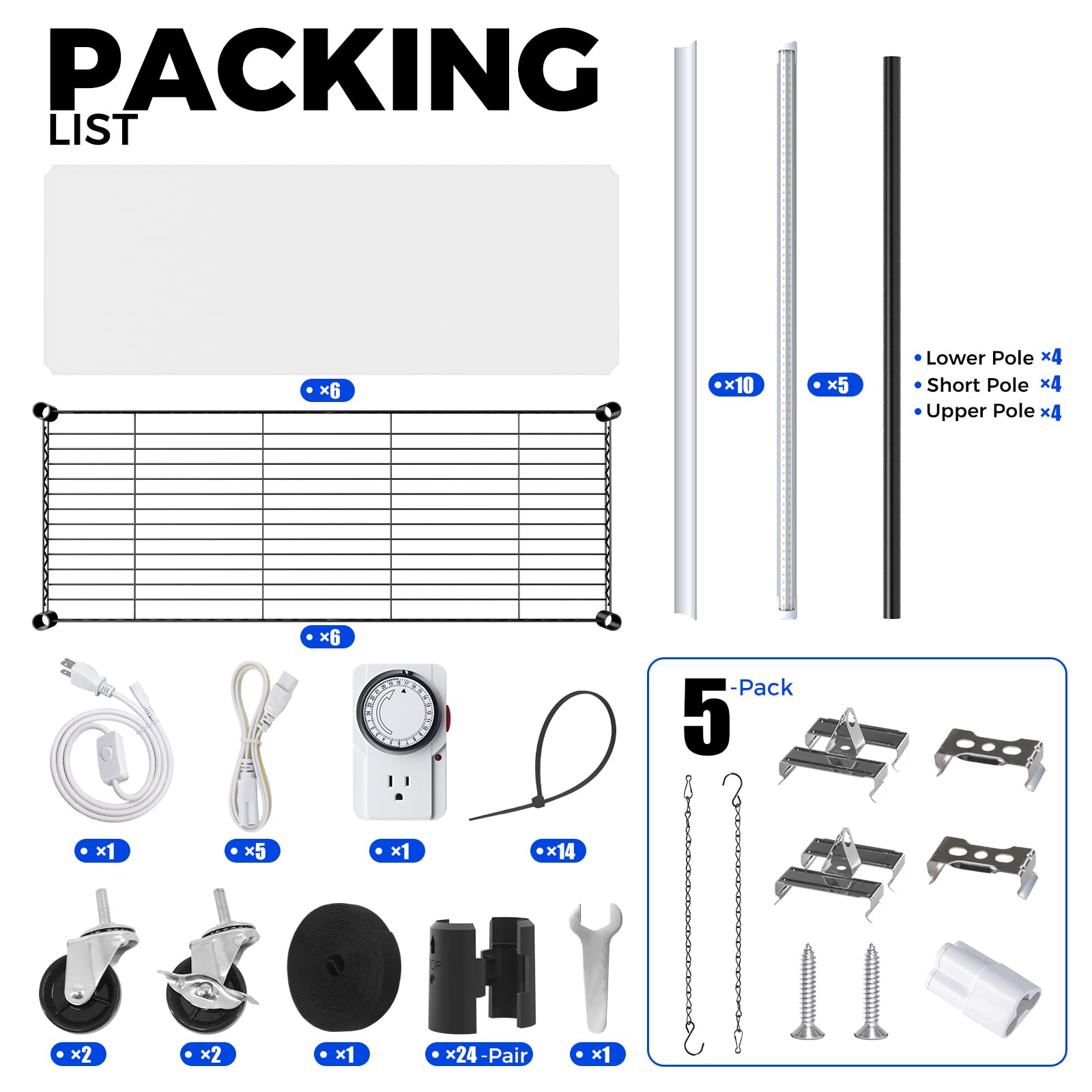 Package: 5 X 35.4" Barrina grow lights for plant shelf, 5 X 39.4" connecting cables, 1 X 59" power cord with on/off, 1 X storage tape, 6 X wire racks, 4 X wheels, 6 X PP pads, 5 X T8 grow light accessory kits, 1 X plant stand accessory kit. Compatible with Barrina OS Series Cords