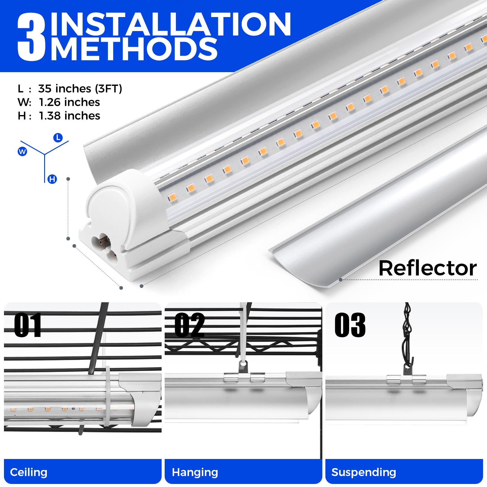 Full Spectrum Grow Light: Including 5pcs 3FT 30W T8 LED yellow grow lights, each with a reflector to increase efficiency, promote plant growth and protect your eyes. Yellow light is more suitable for the growing and flowering period of plants, such as vegetables, fruit trees, leafy vegetables, flowers, indoor foliage plants