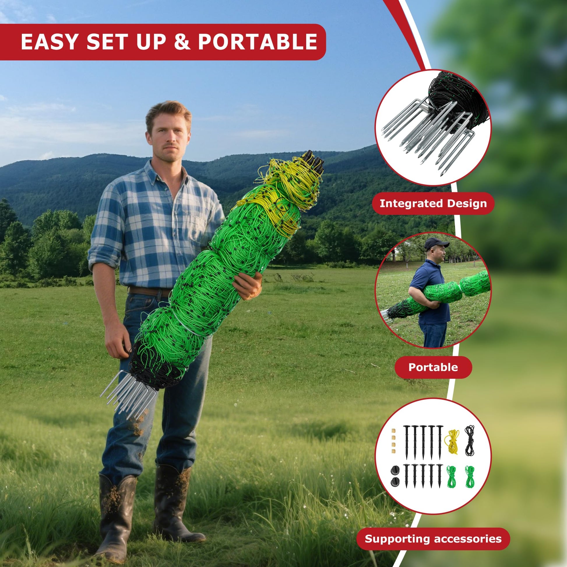 High-Quality Construction: Our Electric Fence Netting is crafted from durable PE material and stainless steel mesh, ensuring superior longevity and performance. With 14 pre-assembled fiberglass posts and double-point steel stakes, you can trust in its strength for long-term use.