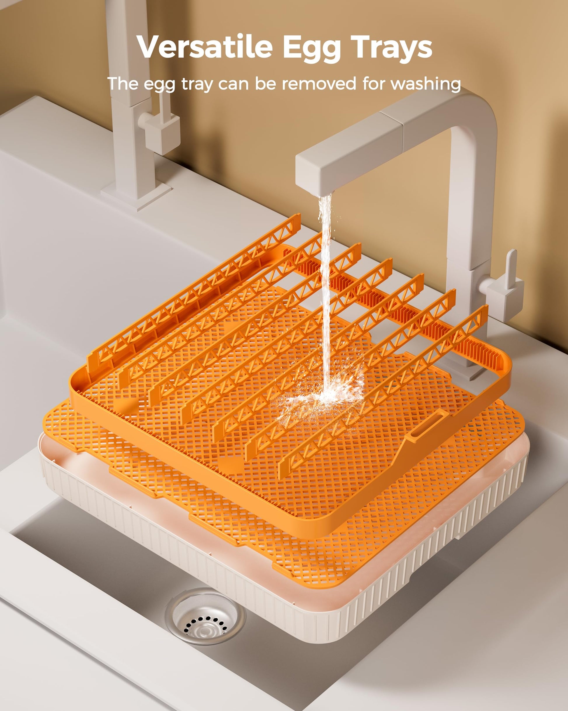 CLEAR VIEW & EASY CLEANING - Oversized transparent ABS lid design allows full observation of the hatching process, ideal for educational demonstrations and production monitoring. Removable egg trays withstand scrubbing, the PVC shell wipes clean with a damp cloth