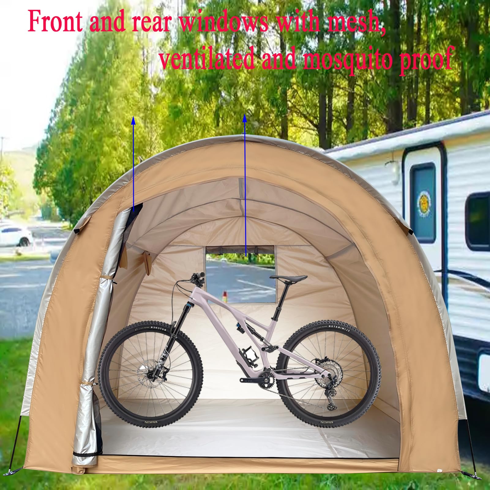 High quality materials】【The bicycle shed is made of high-quality 420D polyester Oxford cloth, which has the characteristics of tear resistance, waterproofing, UV protection, wind resistance, etc. High quality fabrics can avoid sunlight exposure, prevent equipment aging, and small window designs facilitate ventilation. The doors and small windows are equipped with mesh to prevent mosquitoes and insects
