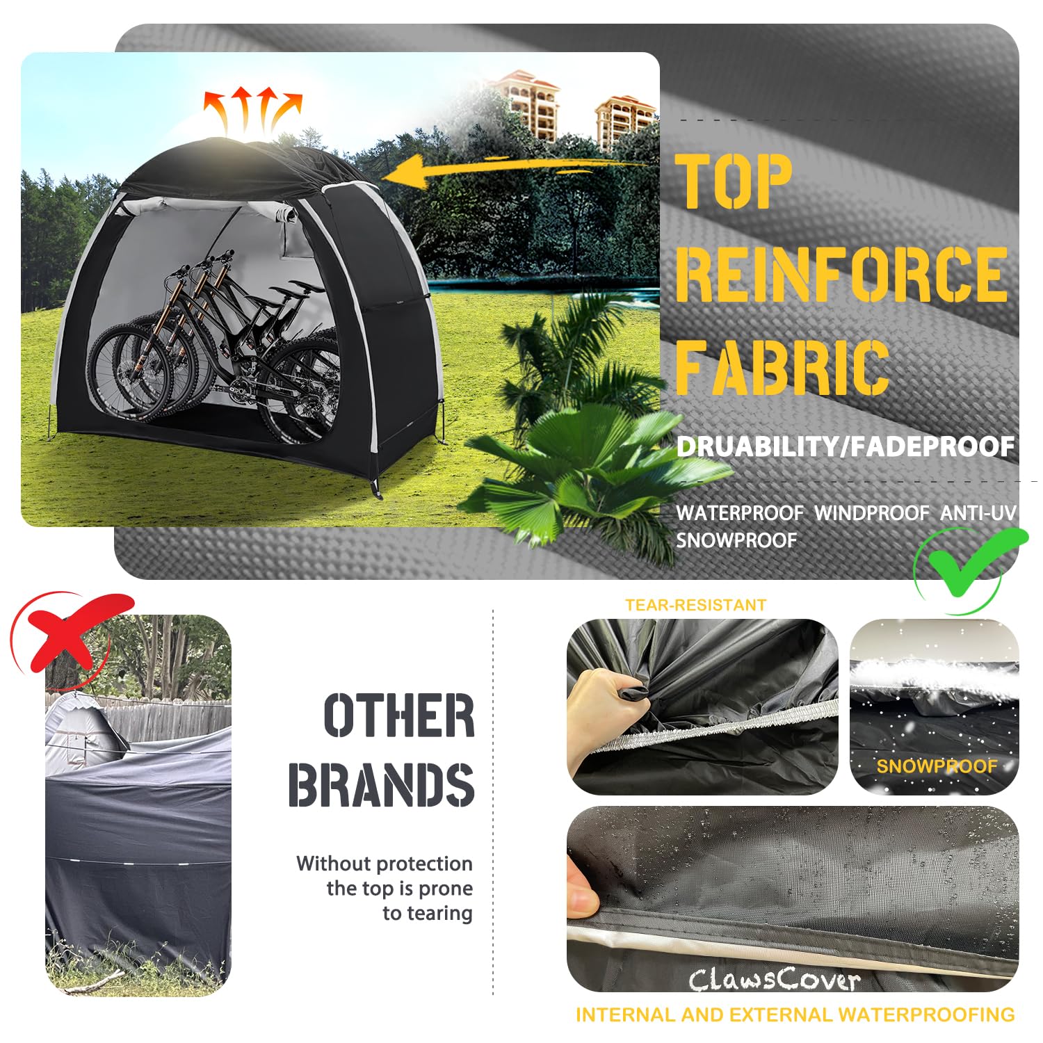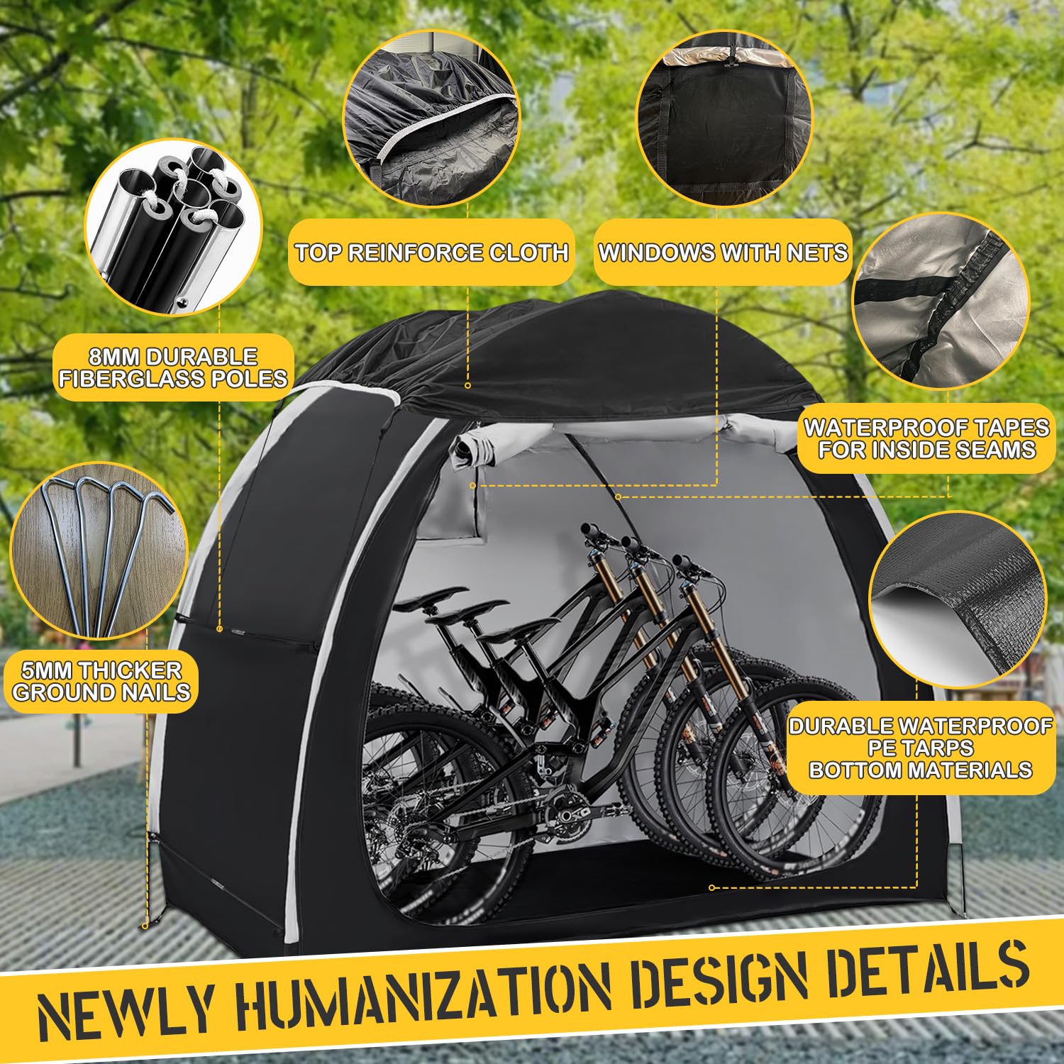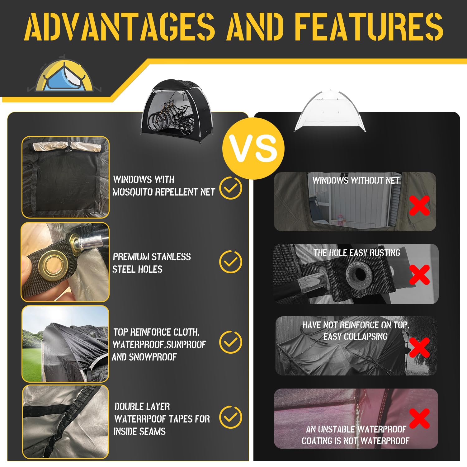 Upgrade Details Design: We have made many improvements than old style bike tent. We added a sunshade cloth on the top, which can effectively reduce the impact of rain, snow on the top of the bike shed, making bike storage shed more stable. We added a net to the tent window to prevent flying insect from entering your tent. and we have applied 2 layers of waterproof coating at the internal seams of the bicycle tent, which provides better waterproofing,keeps the bicycle shed dry all the time