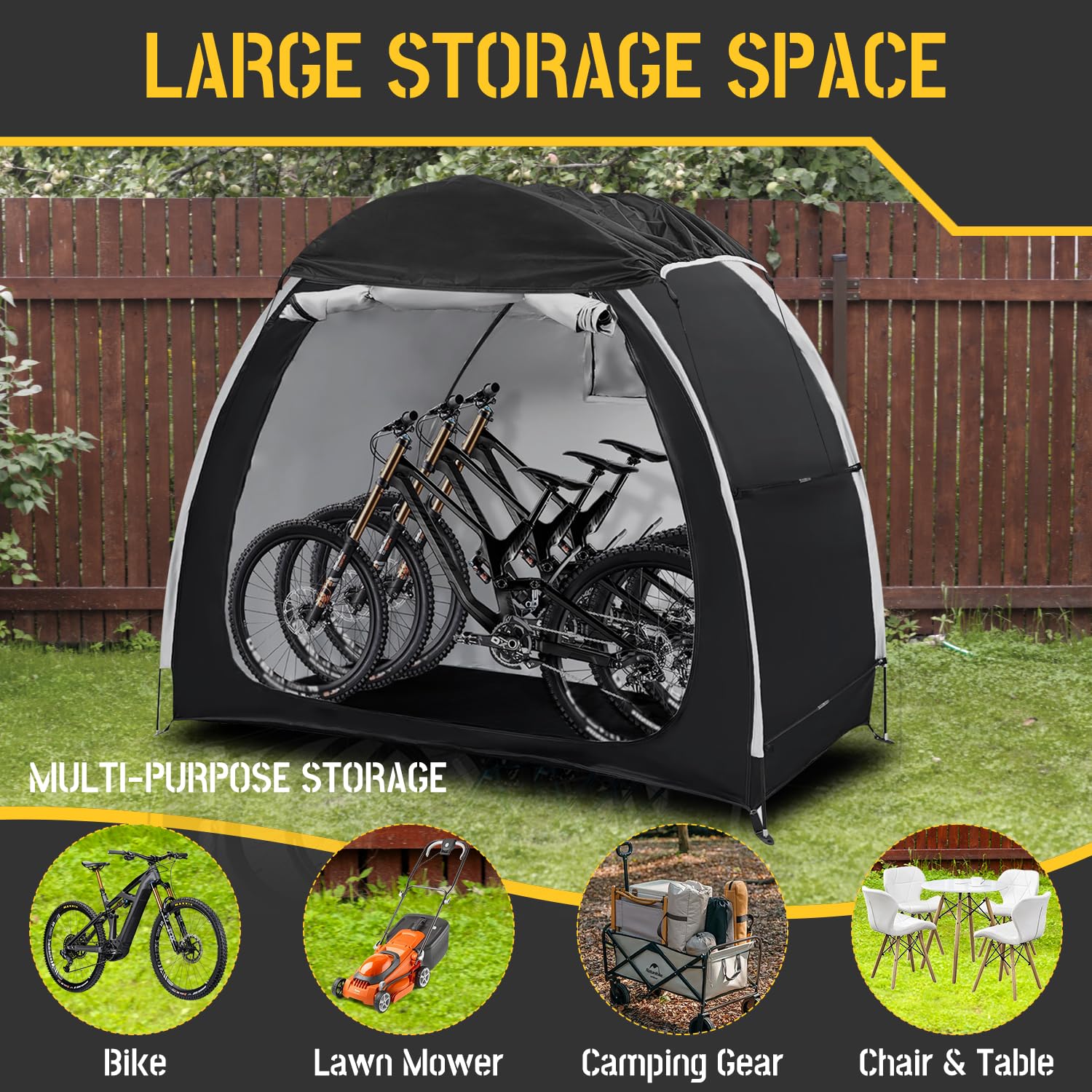 100% Waterproof,UV-Resistant: The bike storage shed all seams are sealed with black waterproof tape to prevent rainwater penetration, our waterproof sealing performance is excellent, you can't see any light when looking outside from inside the bicycle tent, So you don't need to worry that the rain will damage the bicycles and items in the tent, we have thickened the UV-resistant coating on the fabric, which can resist the attack of strong ultraviolet rays and is not prone to fading or aging