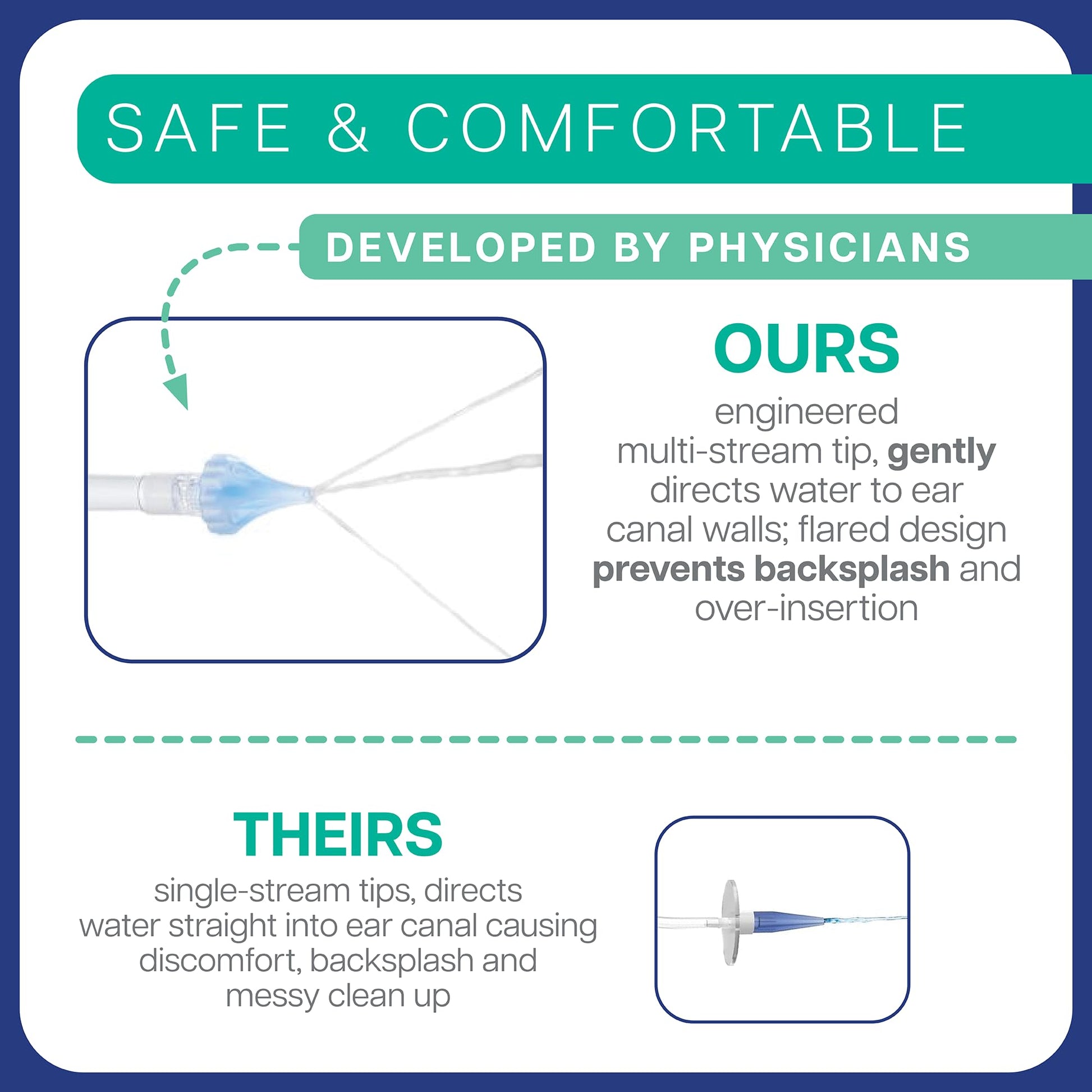 SAFE: This ear irrigation kit utilizes flared ear irrigation tips that direct water toward the ear canal wall with three divergent streams, effectively irrigating without damaging the eardrum.