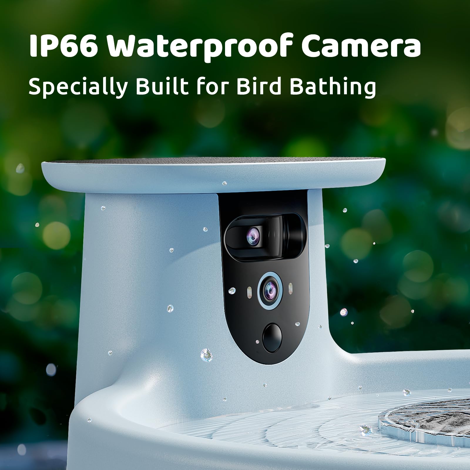 【Smart Bird Bath with a Dual-Lens Camera】The Birdfy Bath Pro features an integrated smart camera that allows bird lovers to enjoy real-time views and recordings of birds bathing & drinking, capturing lively and engaging moments that bring joy and relaxation. Equipped with a dual-lens camera—a wide-angle lens paired with an automated tracking lens—delivers super sharp 2K videos and photos to your phone.