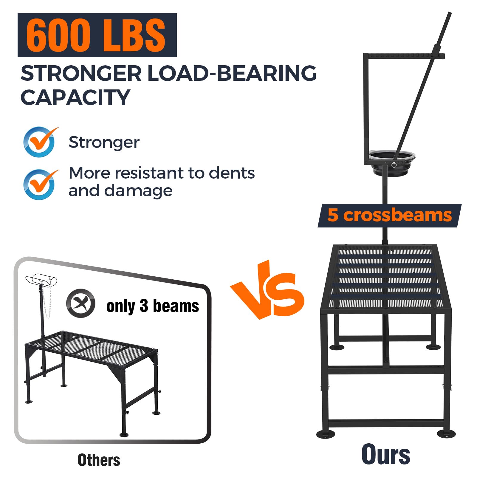 600LBs Sturdy Goat Stand: Two additional load-bearing beams have been added In order to reinforce the expanded metal and to support up to 600LBs for adult sheep; The stable triangular frame design makes this livestock stand very sturdy and stable