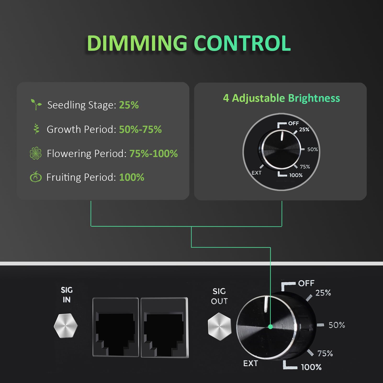 【4- Level Dimmable Brightness】: There is a dimmer knob on the sides of the LED grow lamp, which makes it dimmable to different brightness (4-level brightness: from 25%-50%-75%-100%) for various plants.