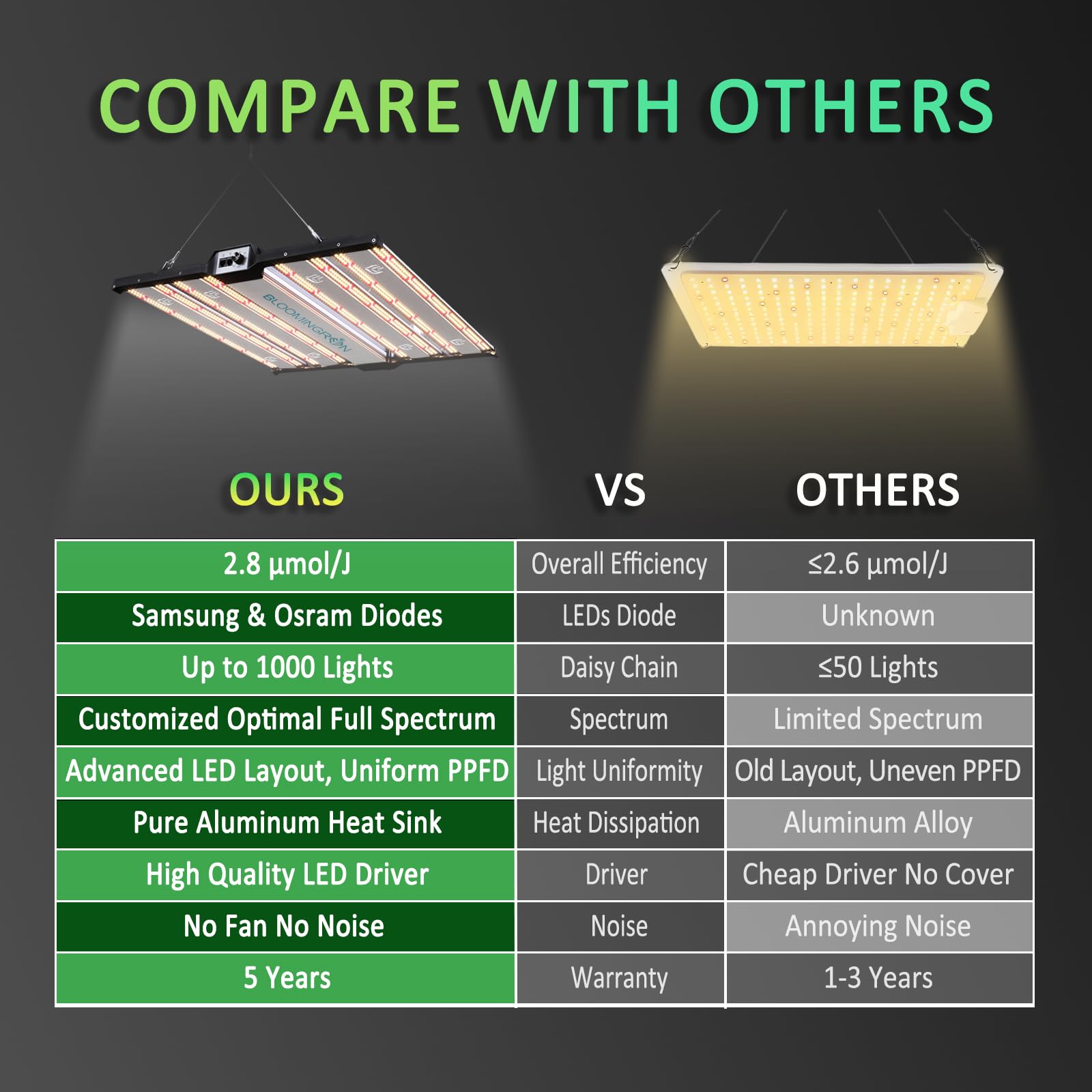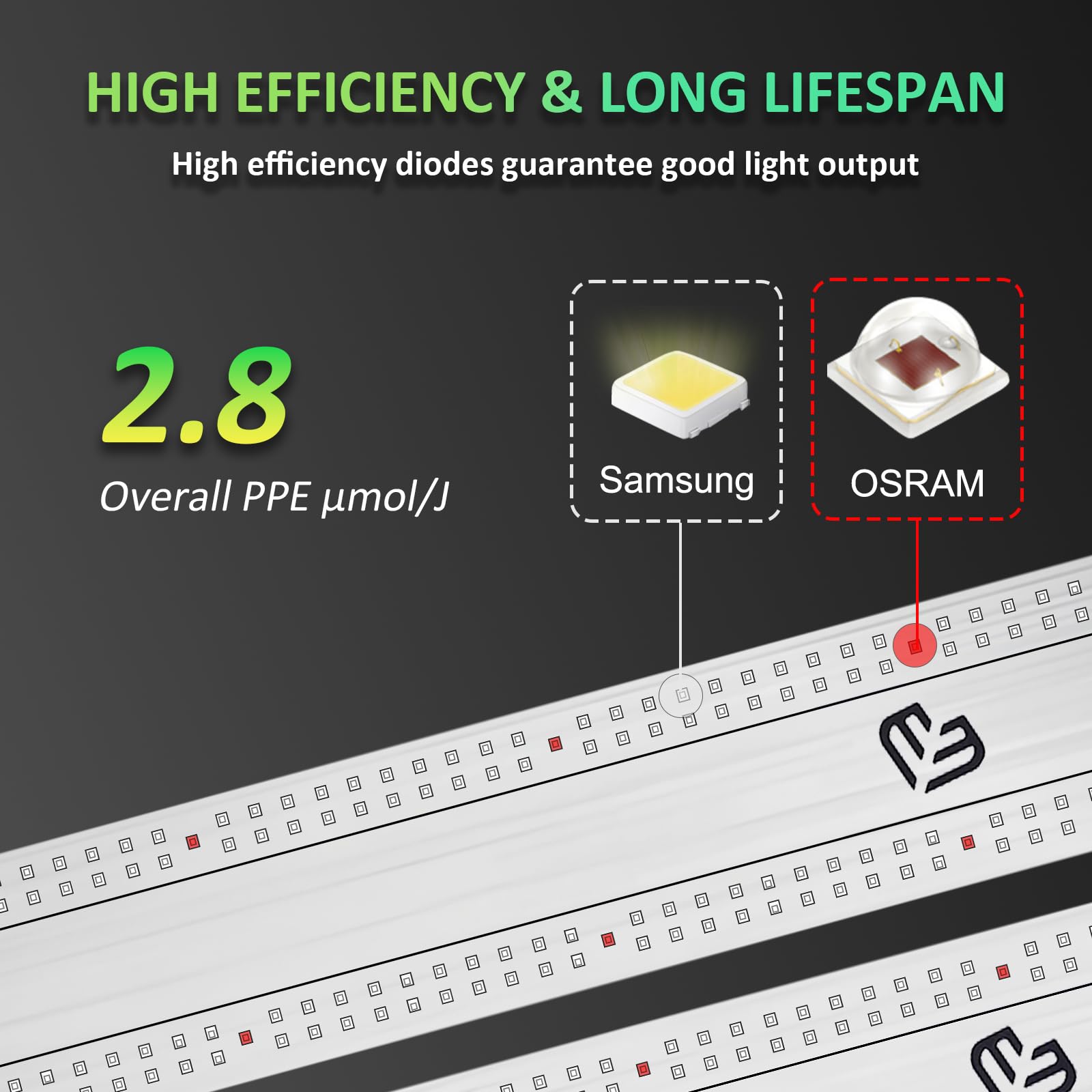 ☀ Our new LED plant grow lights have a powerful light output and uniform canopy penetration with better light absorption by plants. It uses the high-efficiency LED plant light technology and premium Samsung LM301B diodes, which deliver an overall PPE of 2.8 μmol/j and the energy consumption is only 300 watts, providing you the excellent choice for you with cost-effective.