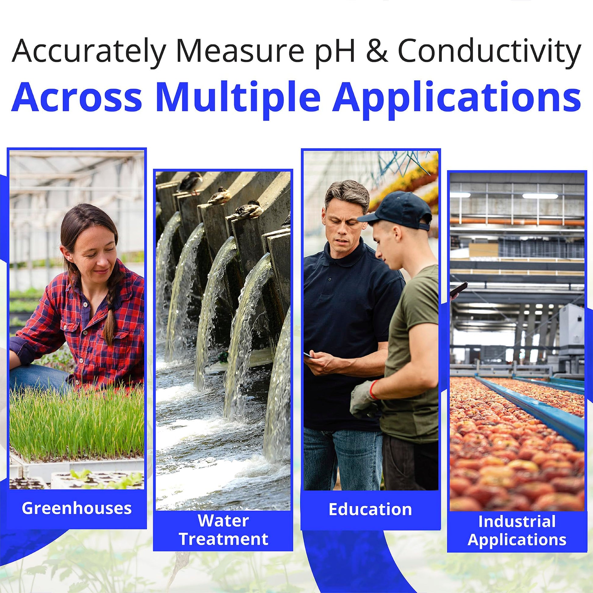 Monitor 3 parameters in water and soil: Conductivity (TDS/PPM) level to ensure plants get the balanced feed, pH up and down, and temperature with lab quality glass probe; Gereral uses include growing tent, swimming pool, drinking water, and aquarium