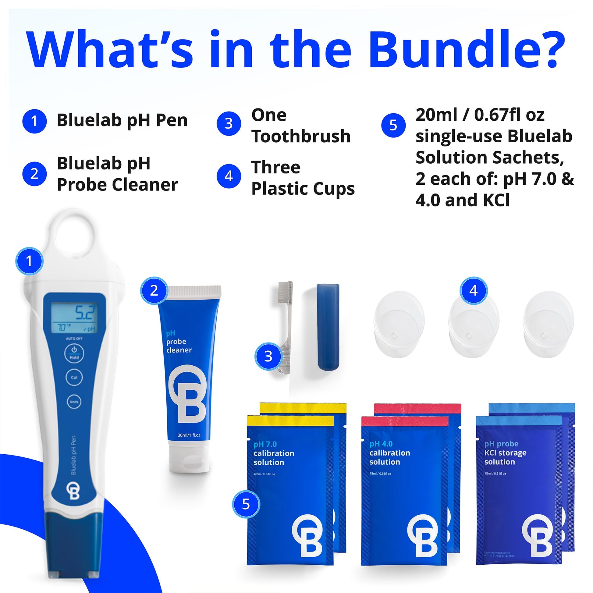 Comprehensive Care Kit: The Bluelab Probe Care Kit pH includes everything you need to maintain your pH pen, including probe care instructions, 18 ml single-use Bluelab Solution Sachets for calibration (two each of pH 7.0, pH 4.0, KCl solutions), and three plastic cups for mixing solutions.