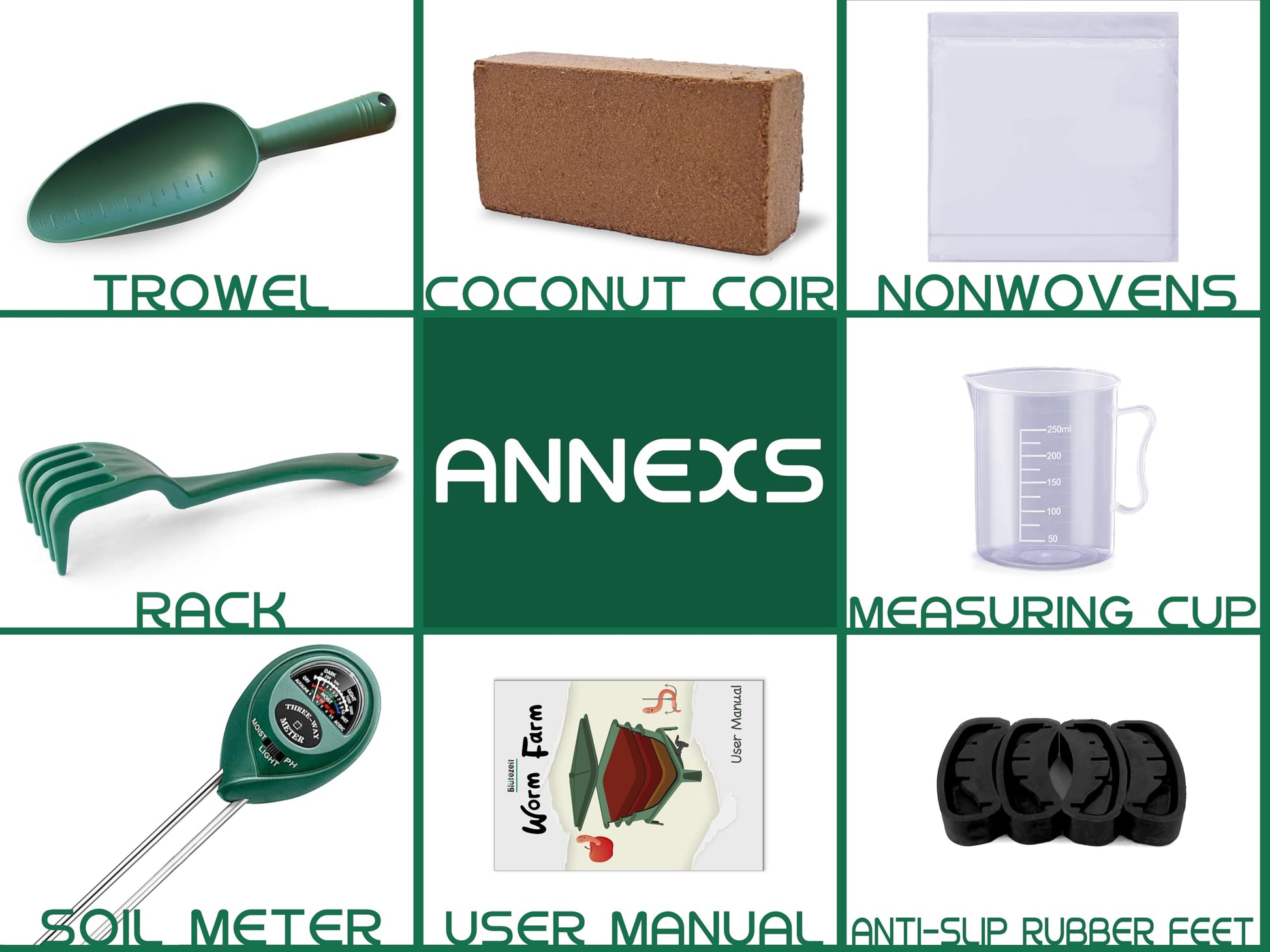🌲【All-in-One Composting Kit】 - Enhance your composting journey with our all-in-one kit, including a Turning Fork, Shovel, Soil Meter, Non-woven Fabric, Coco-coir Brick, Anti-slip Feet, Cup, and Spigot for worm tea. The Soil Meter ensures ideal moisture, pH, and light levels, while our detailed User Manual offers fun and easy step-by-step guidance for success compost. Worms NOT included.