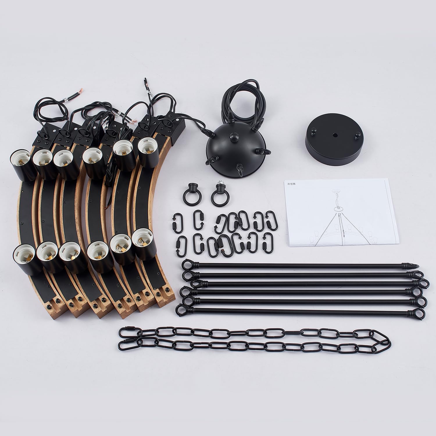 Double Wooden Wagon Wheel Chandelier: The 24-Light farmhouse wood chandelier is full of allure; it comes with a matt black high-quality metal canopy and 16*bulbs base + 8*bulbs base, fully lighting up your house with a retro atmosphere and comfortable feeling.