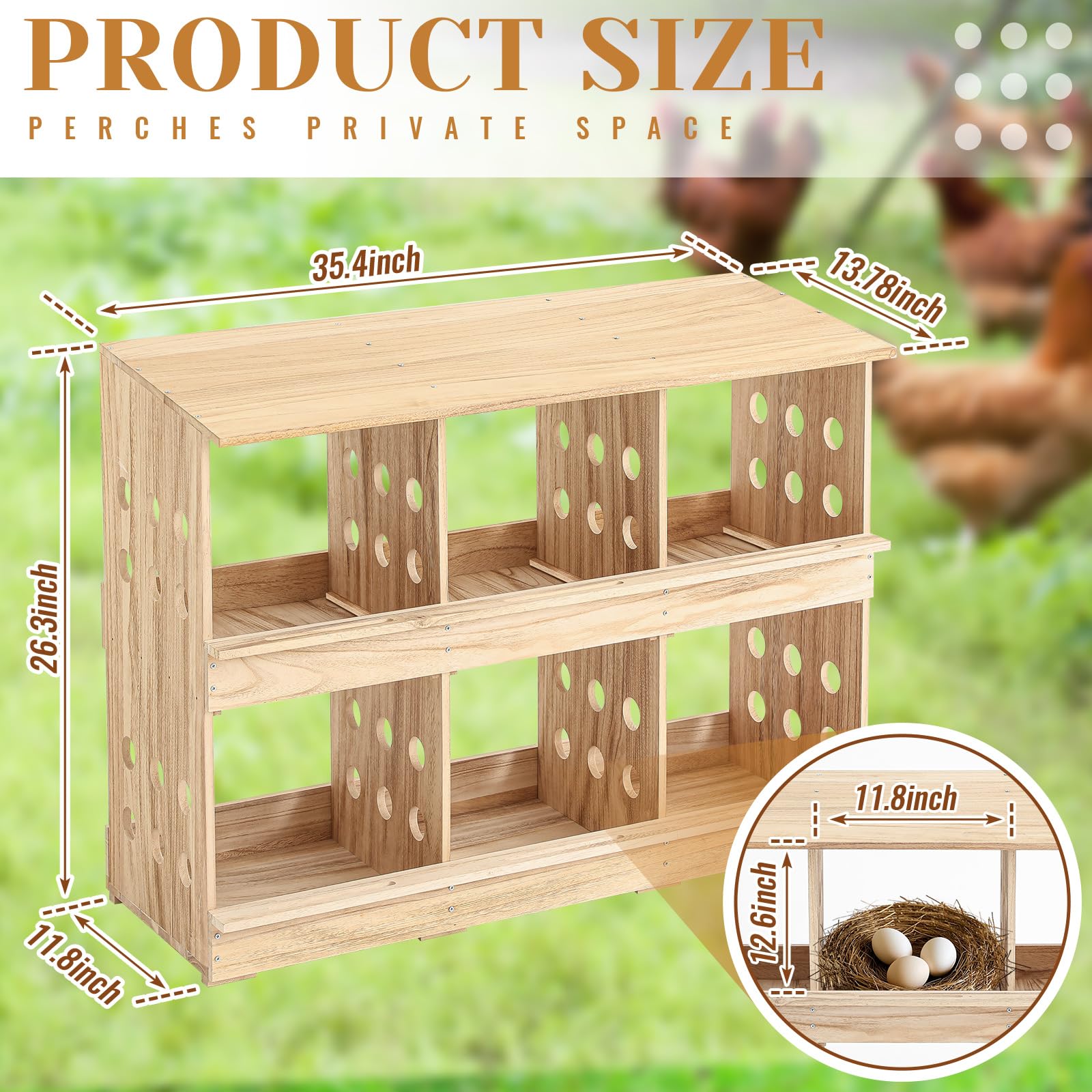 Chicken Coop: our chicken nesting box is made of solid wood, providing a natural and safe environment for chickens to lay eggs; This chicken coop measures about 35 X 26 x 12 inch, and each compartment is about 12.5 x 12 inch