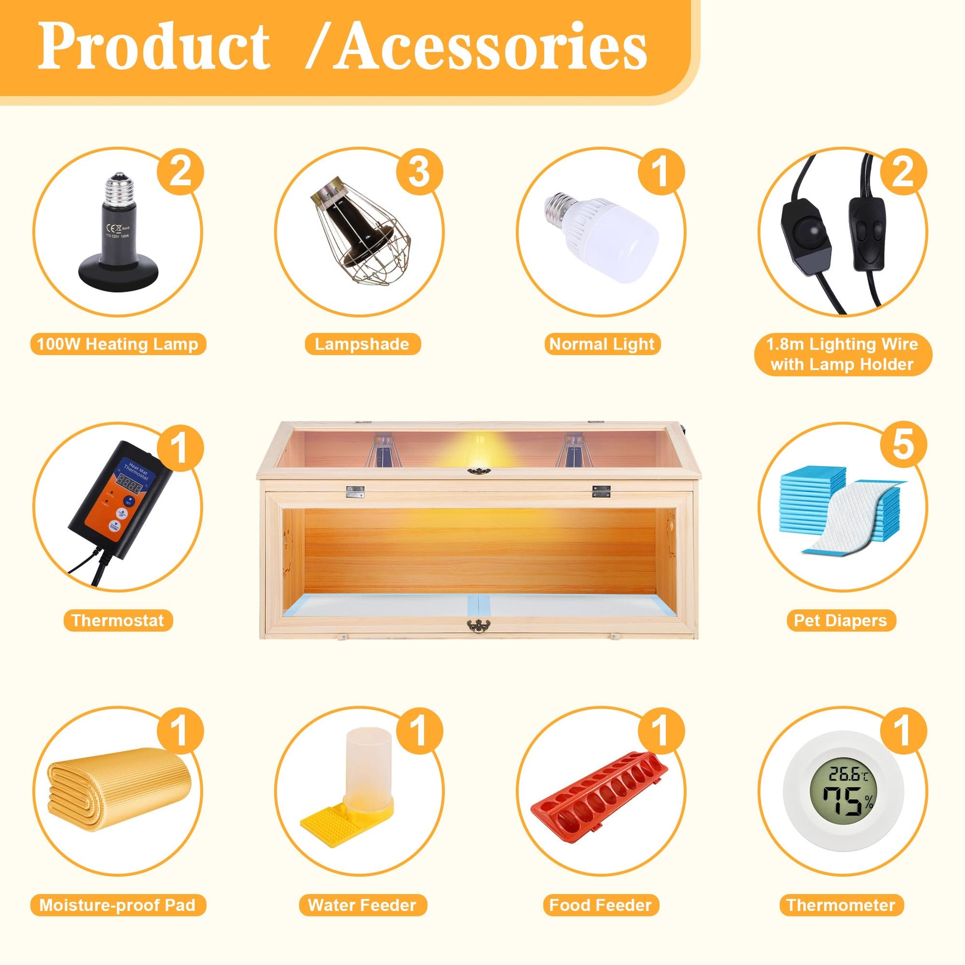 Complete Kit: You will receive everything necessary for effective chick rearing, including one brooder box, one feeding tray, one waterer, one screwdriver, one dimmer switch, one ceramic lamp, one solar lamp, and five pet diapers.