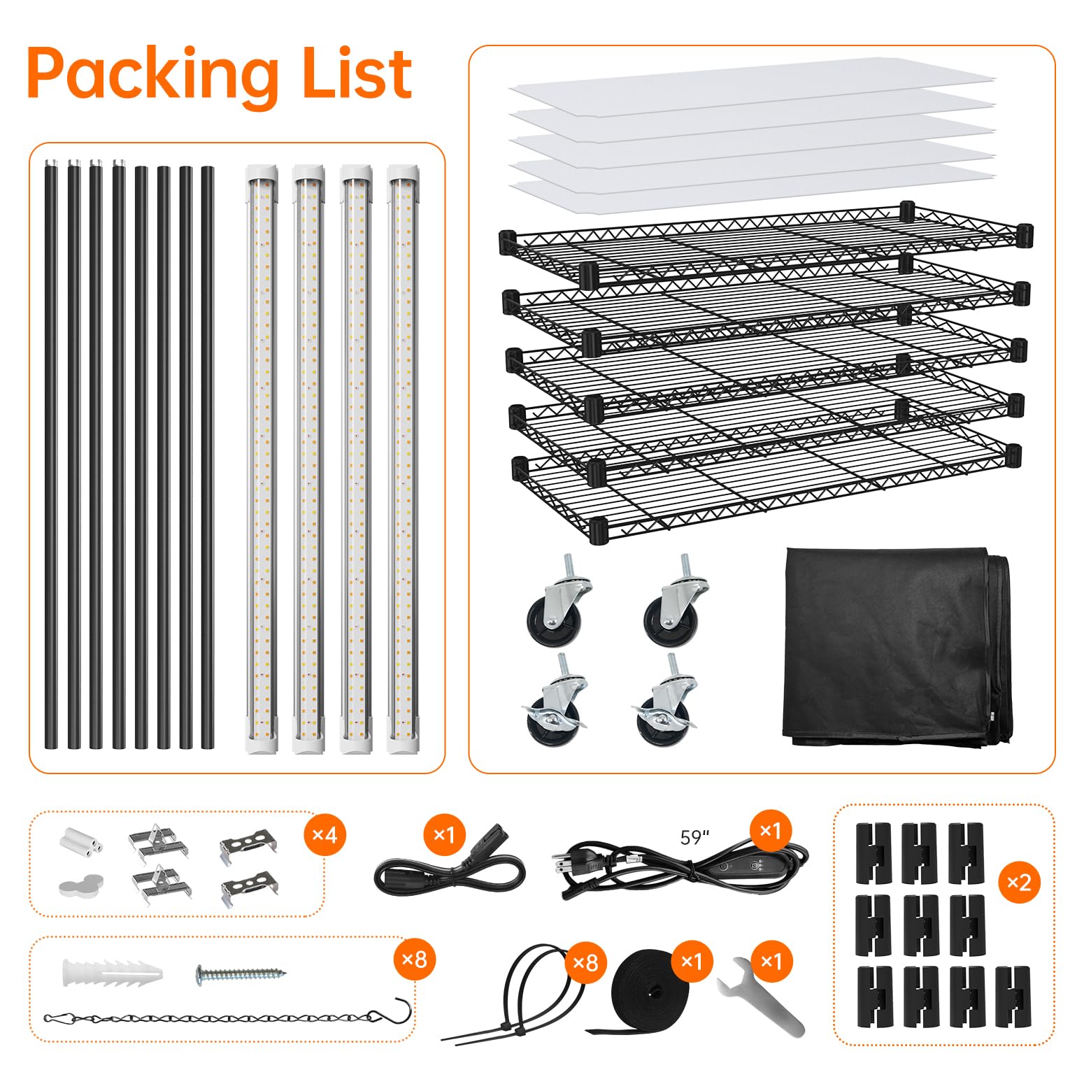 Tool-Free Assembly & Leak-Proof Design - Quick to assemble without tools, this plant shelf with grow light includes 5 PP waterproof mats to protect lights from spills. Complete with 4 lights, metal grow shelves, connectors, and accessories, it’s a hassle-free indoor gardening system for beginners and experts alike