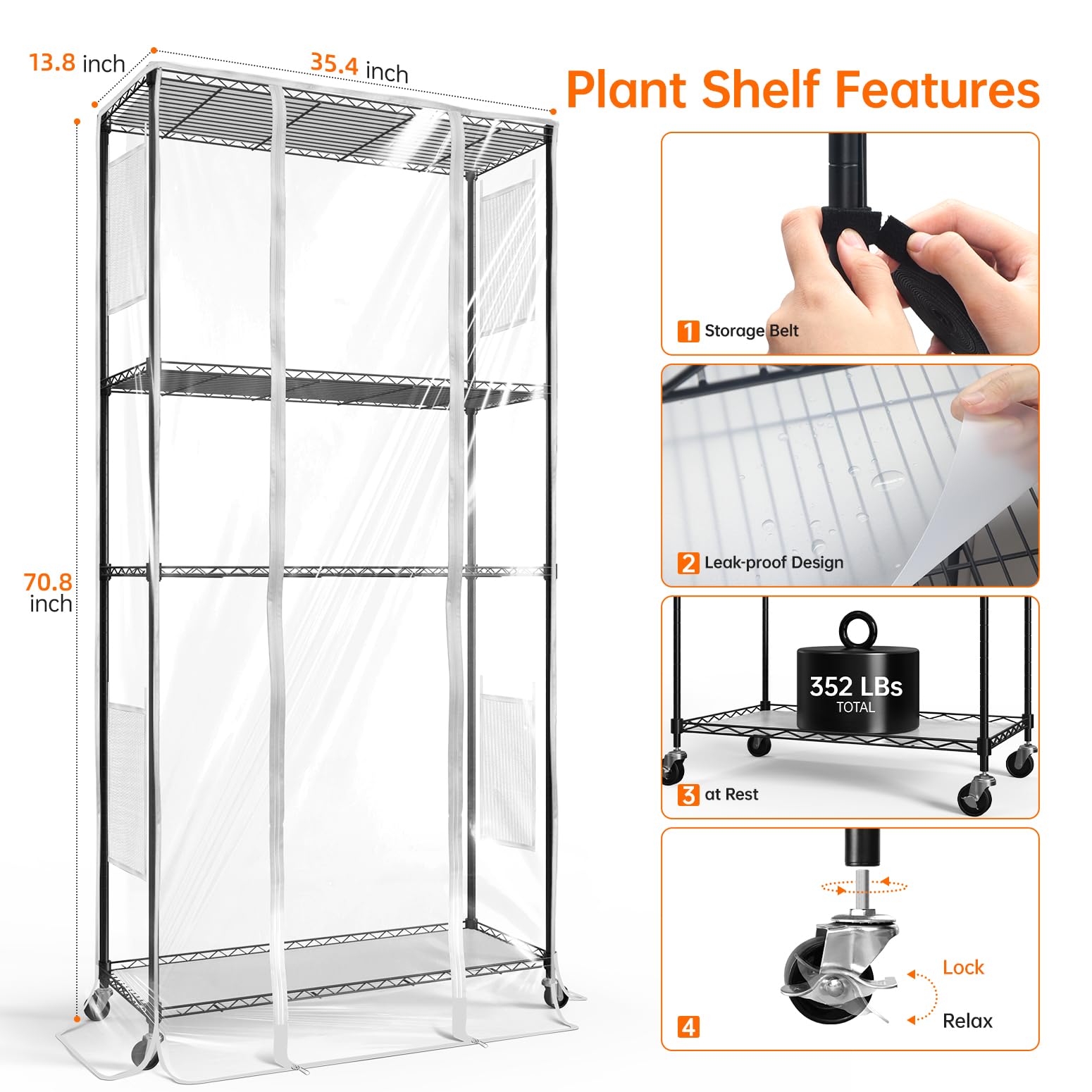 4-Tier Indoor Greenhouse with Grow Lights - This green house measures 35.4 inches long x 13.8 inches wide x 70.8 inches high, providing ample space for your plants. With a total weight capacity of 352 pounds, it’s perfect for accommodating larger plants, tropical varieties, monstera, microgreens, seedlings, and flowers during the cold winter months