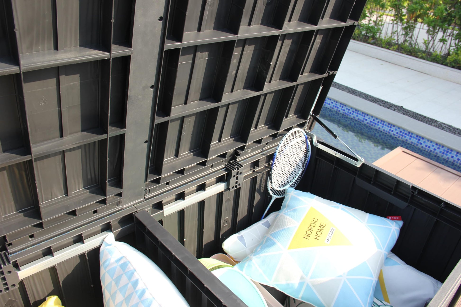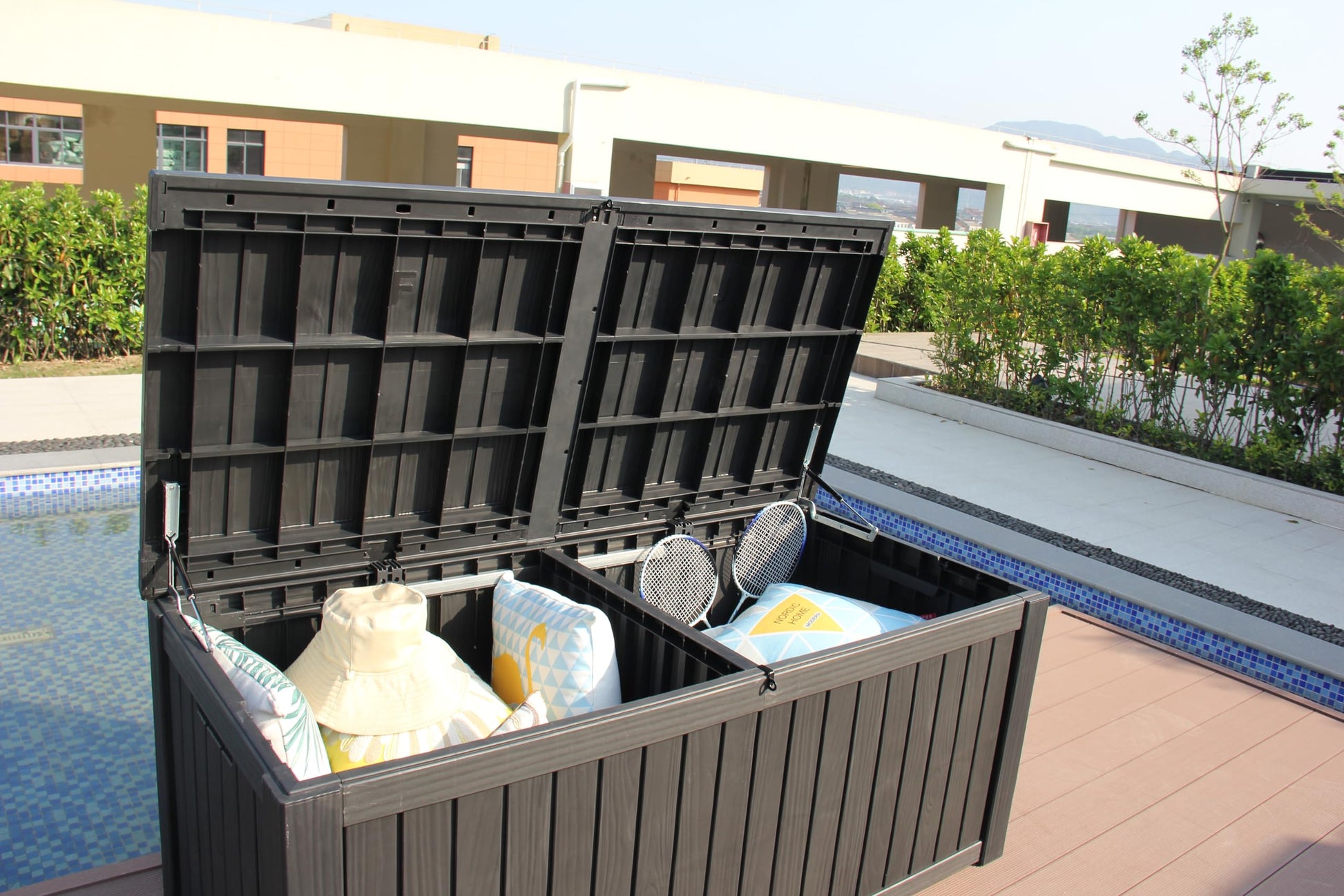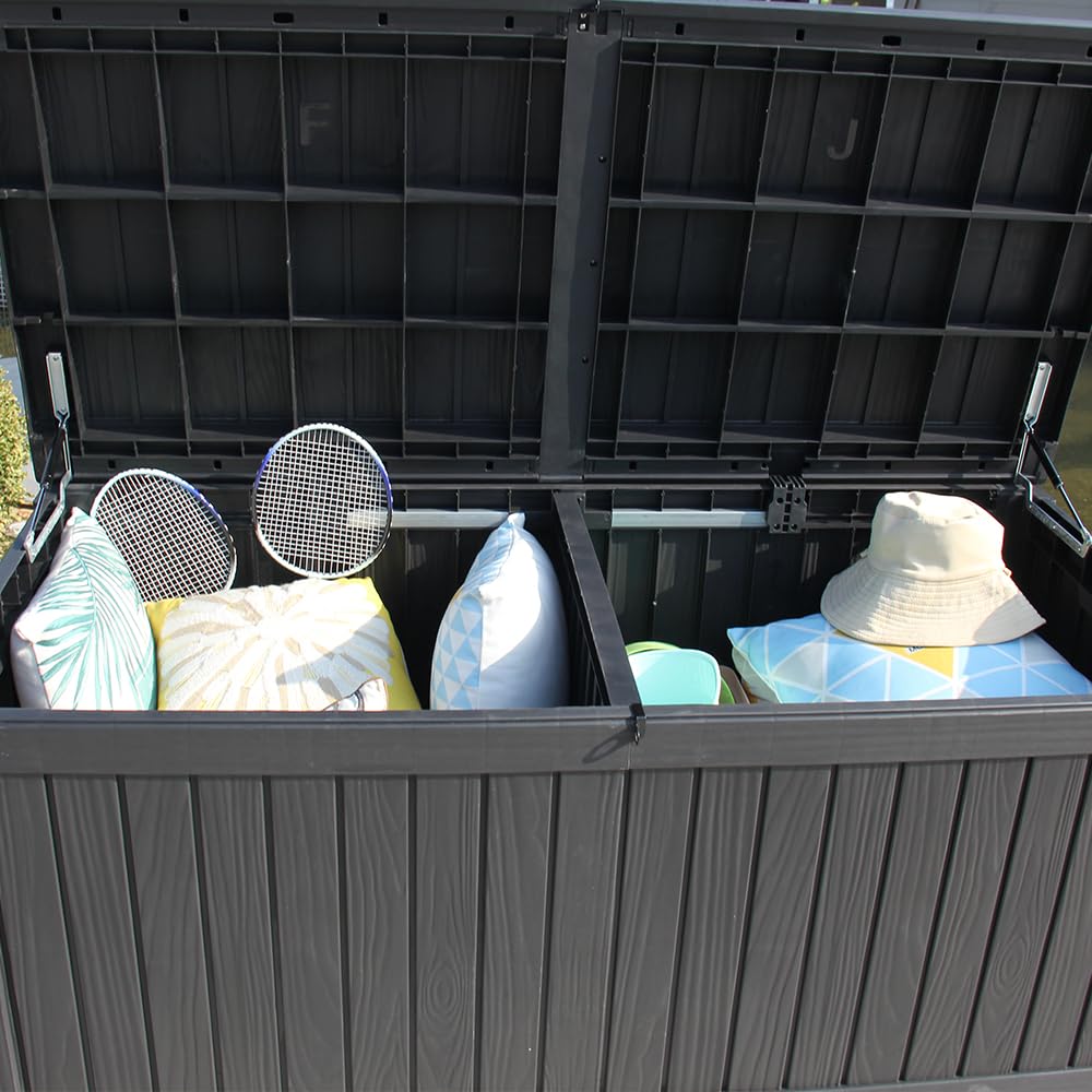 Safe & Soft Hydraulic Lift mechanism for safe opening and closing without risk of hand injury. The UV protection feature helps keep the box appearance & structural integrity over time for long lasting use better than wood or metal. Portable & Lightweight: Lift or move the Patio Container using the Built-in handles on both sides to any required place quickly. Detachable Centre Partition inside, for storing items in sections.