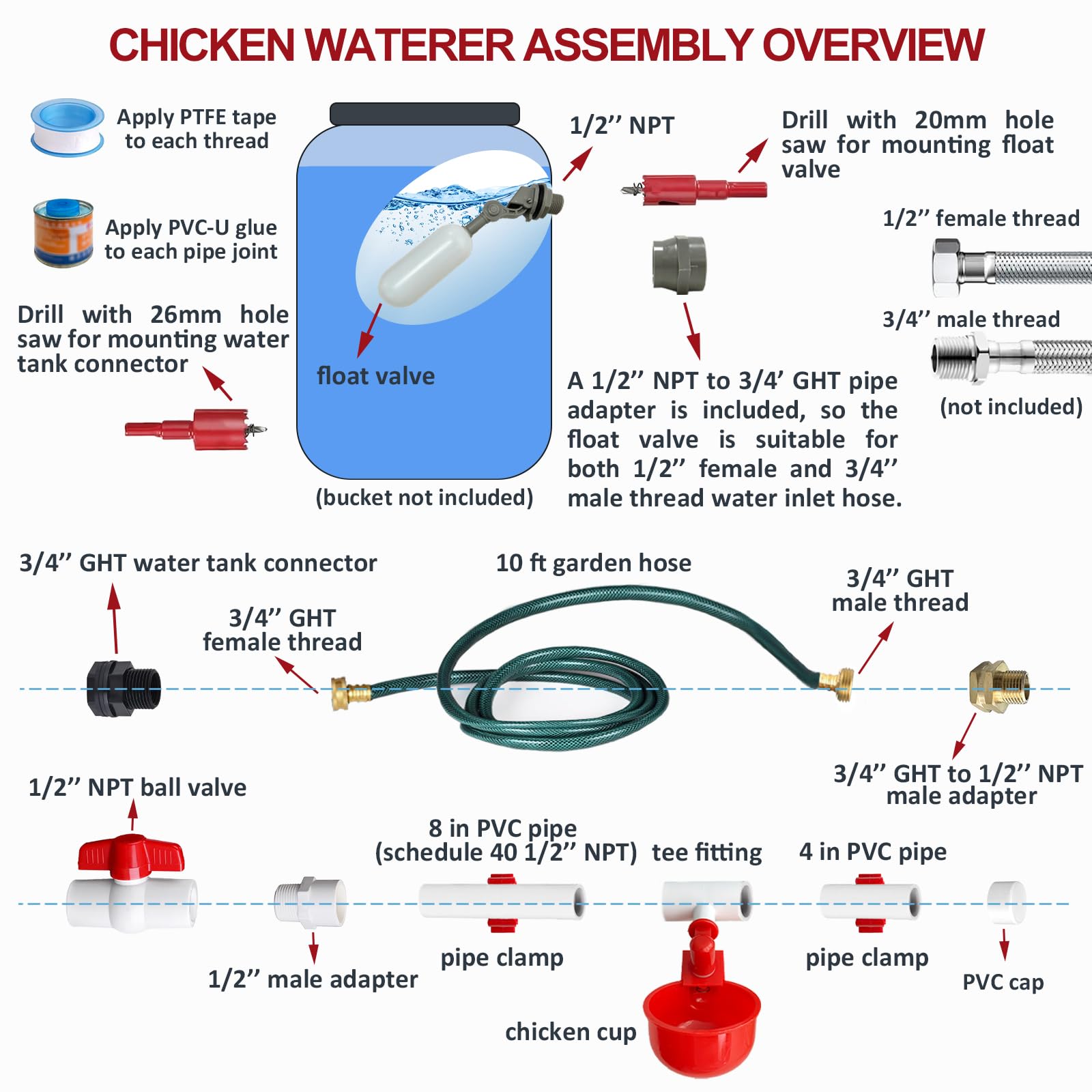 【Leak-Proof Design】Through testing, we have ensured that all accessories of our chicken watering system fit together perfectly, preventing leaks. Additionally, we provide PTFE tape and glue to further enhance the water-tight seal, ensuring a dry and clean coop.