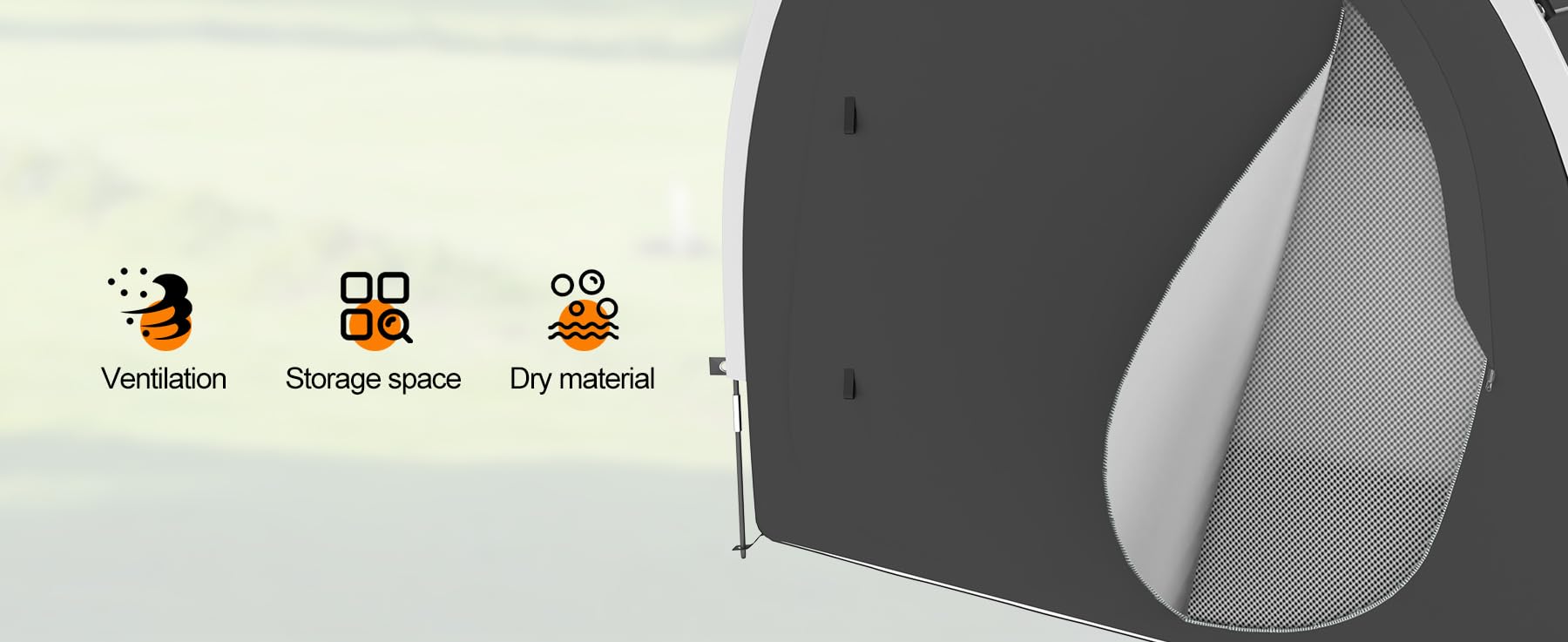 【Multi-scenario Application storage tent】;This storage tent is designed to hold various items likebicycles, Ebikes, motorcycles, mobility scooters, ATVs, UTVs, garden tools, toys, lawn mowers, and similar belongings. It also works as a regular tent for relaxation. Its charm is the multiple protections it offers: rainproof, windproof, sunproof, dustproof and mosquito-proof, ensuring a nice and safe experience.
