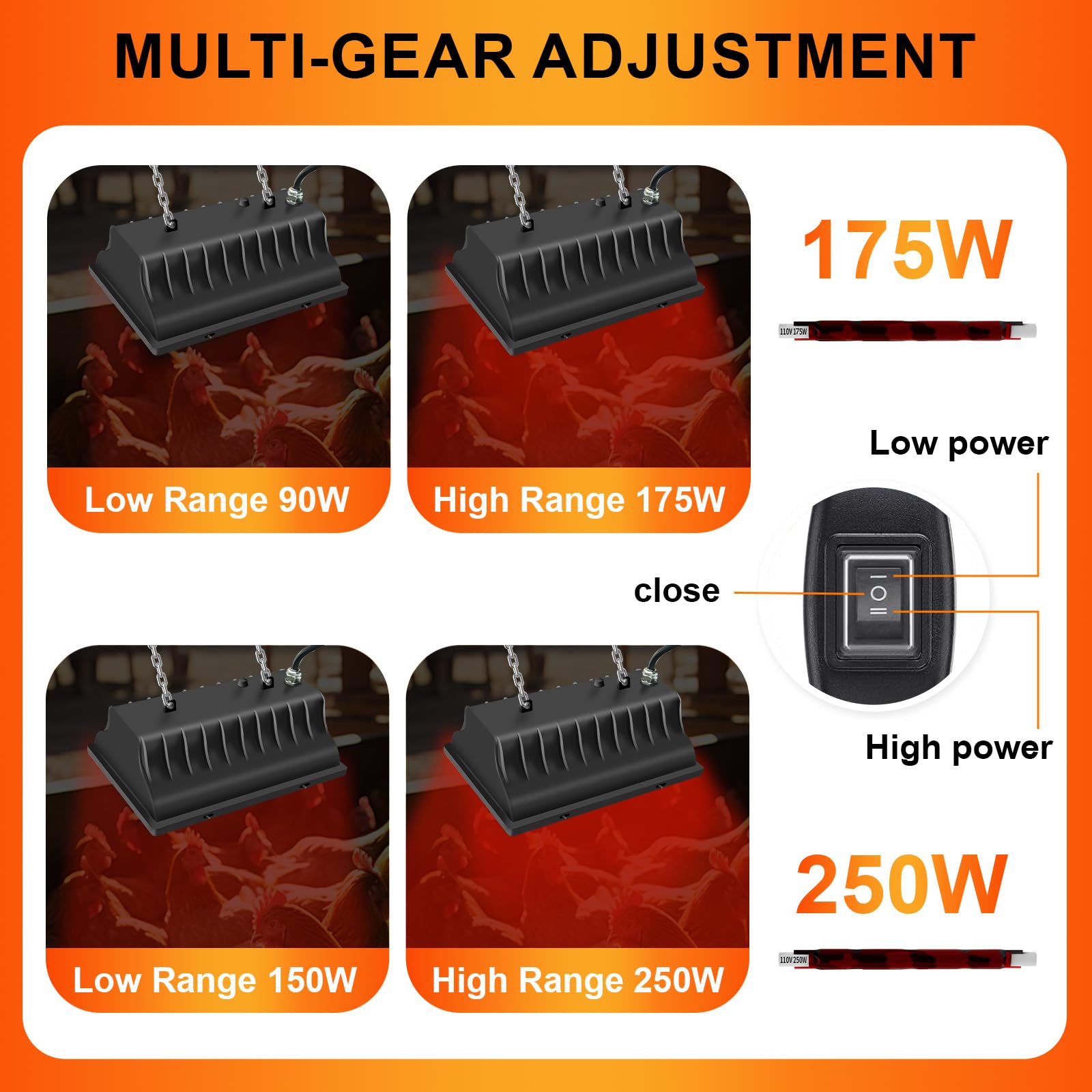 【Adjustable Temperature Range】Our heat lamp comes with two different wattage lamps (175W and 250W) and two adjustable settings, allowing you to adjust the temperature accordingly.
