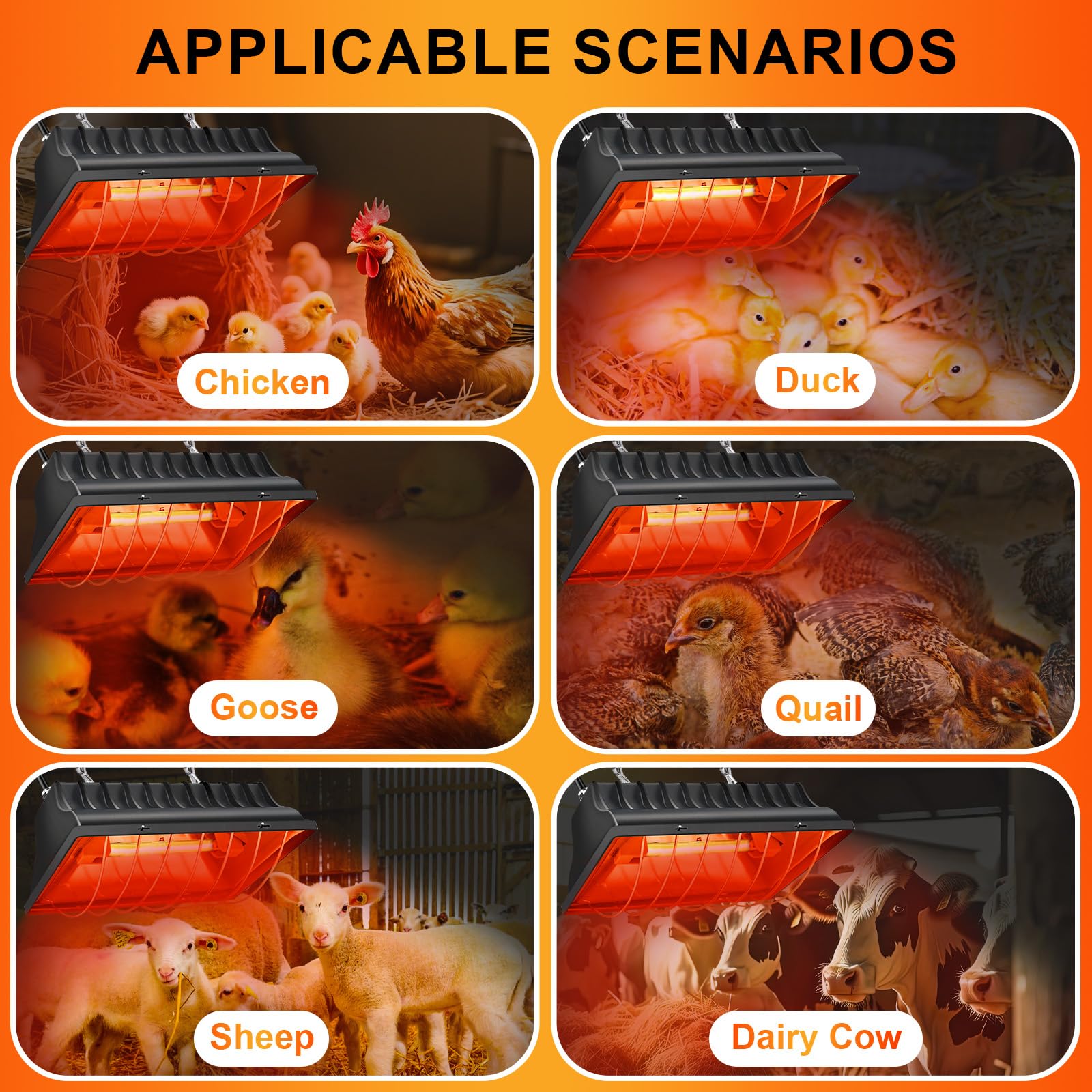 【Chicken Heater】This UL-compliant heating lamp features overheat protection, rapid heating, and a large heating area. Its infrared light source is harmless to your pets, keeping them happy all winter long.