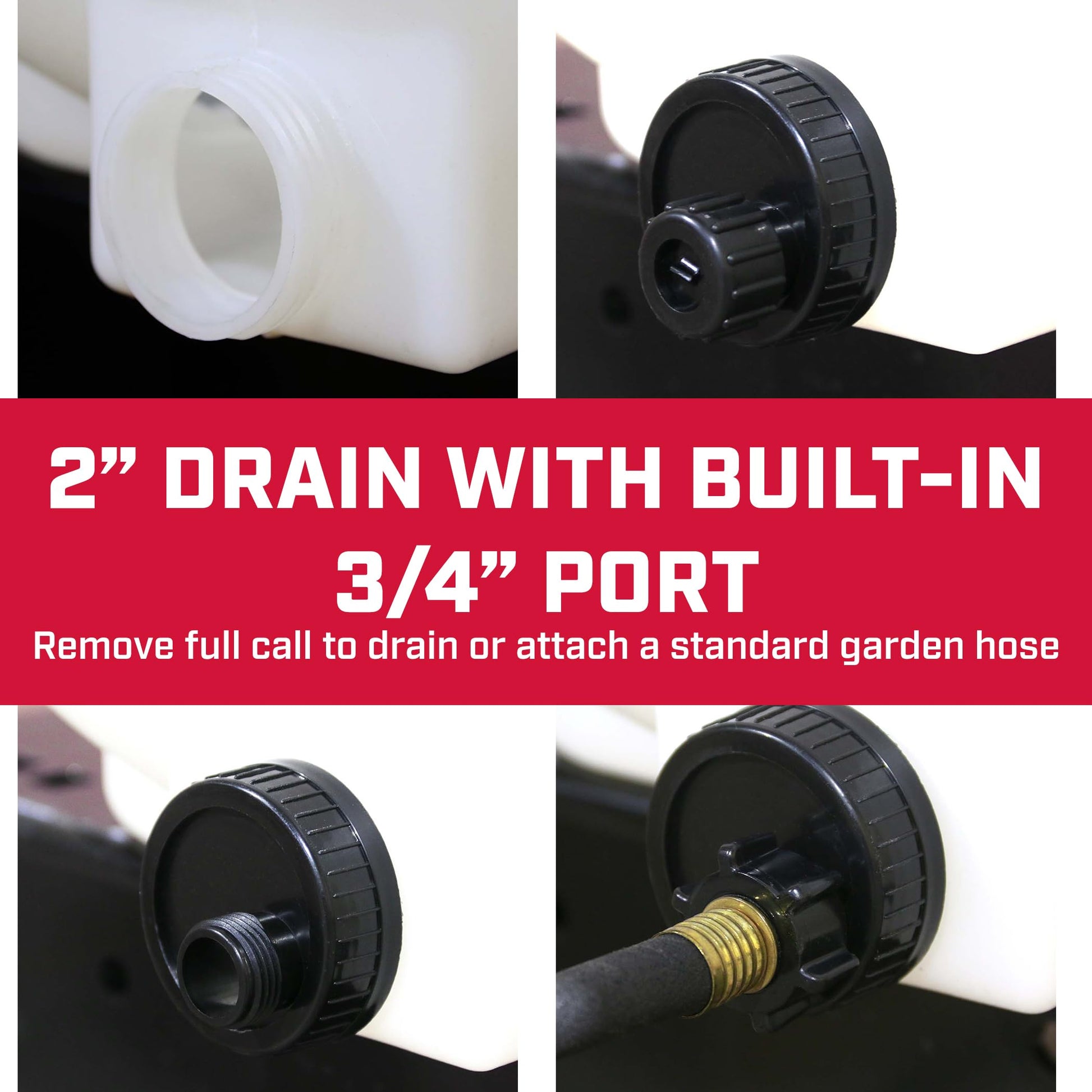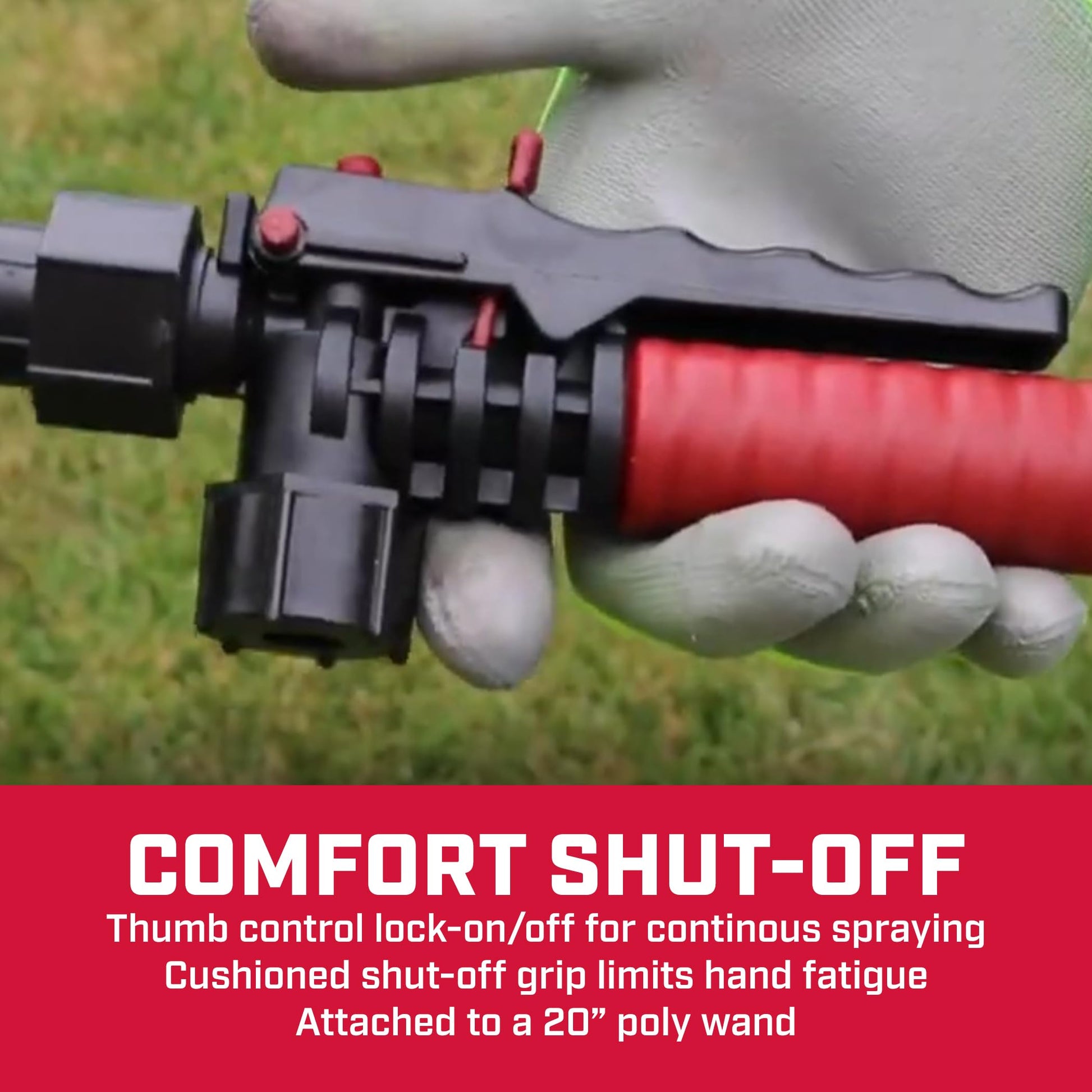COMPONENTS: 20-inch poly spray wand; 180-inches of reinforced hose; poly cushion-grip shut-off with serviceable filter and lock-on feature for comfort and less hand fatigue; 2-inch drain with built-in 3/4-inch port to quickly empty the tank; locking S-clips on ratchet straps included
