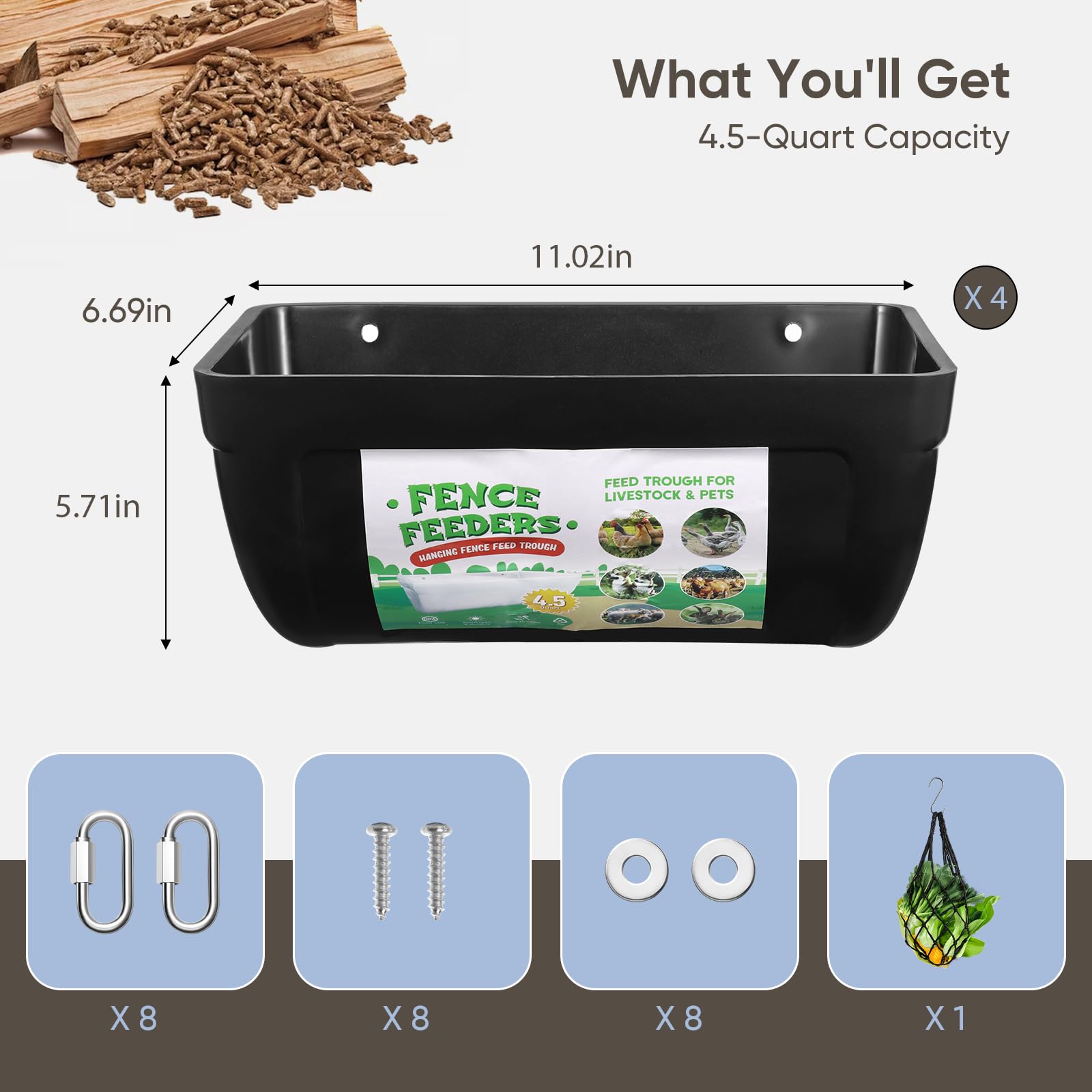 đă4 Pack Feeding Kită Transform Your Feeding Routine with This Complete Kit. You'Ll Receive Four 4.5-Quart Chicken Feeders, Hooks X8,Screws X8, and A Bonus Chicken Coop Treat Bag for Effortless and Hygienic Feeding Without Entering the Coop