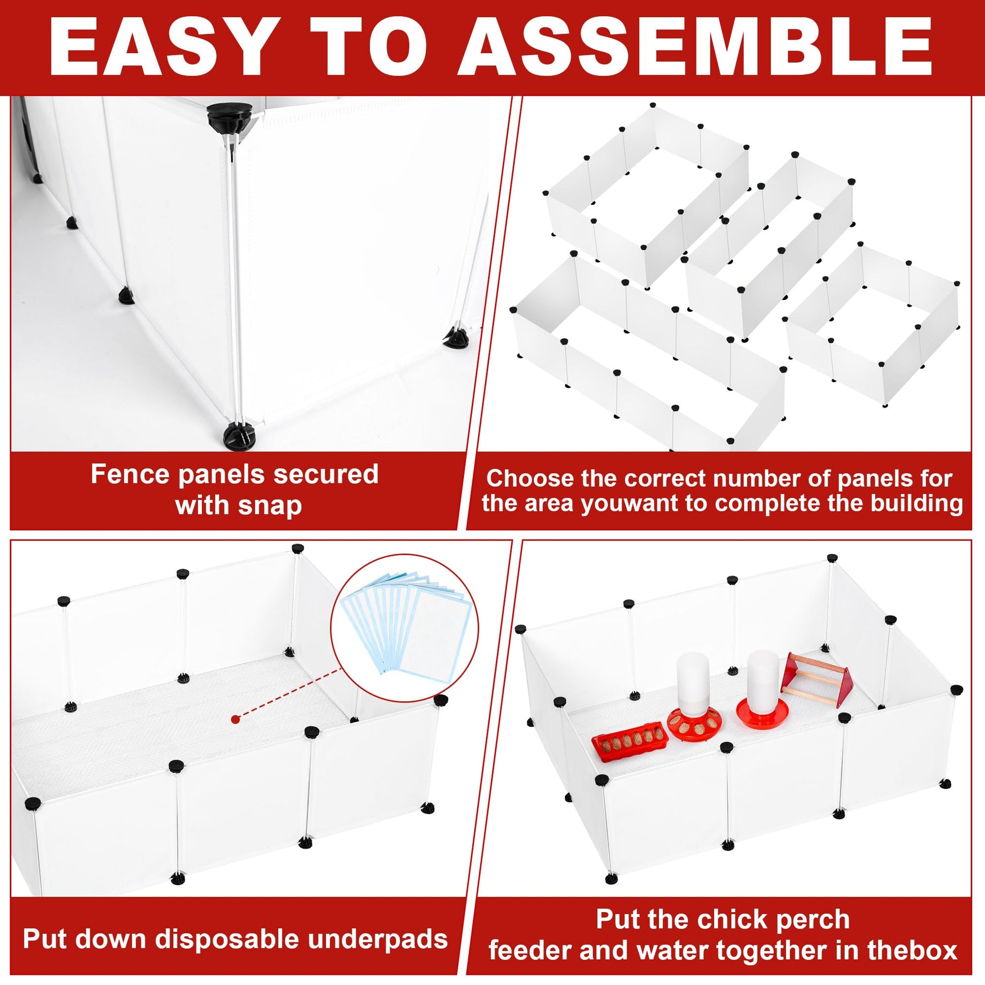 Easy to Assemble: Simply connect the plastic boards using the clips. Customize the shape and size of the enclosure to fit your needs. The boards are easy to disassemble, move, and clean. Lay disposable care pads underneath for hassle-free waste cleanup.