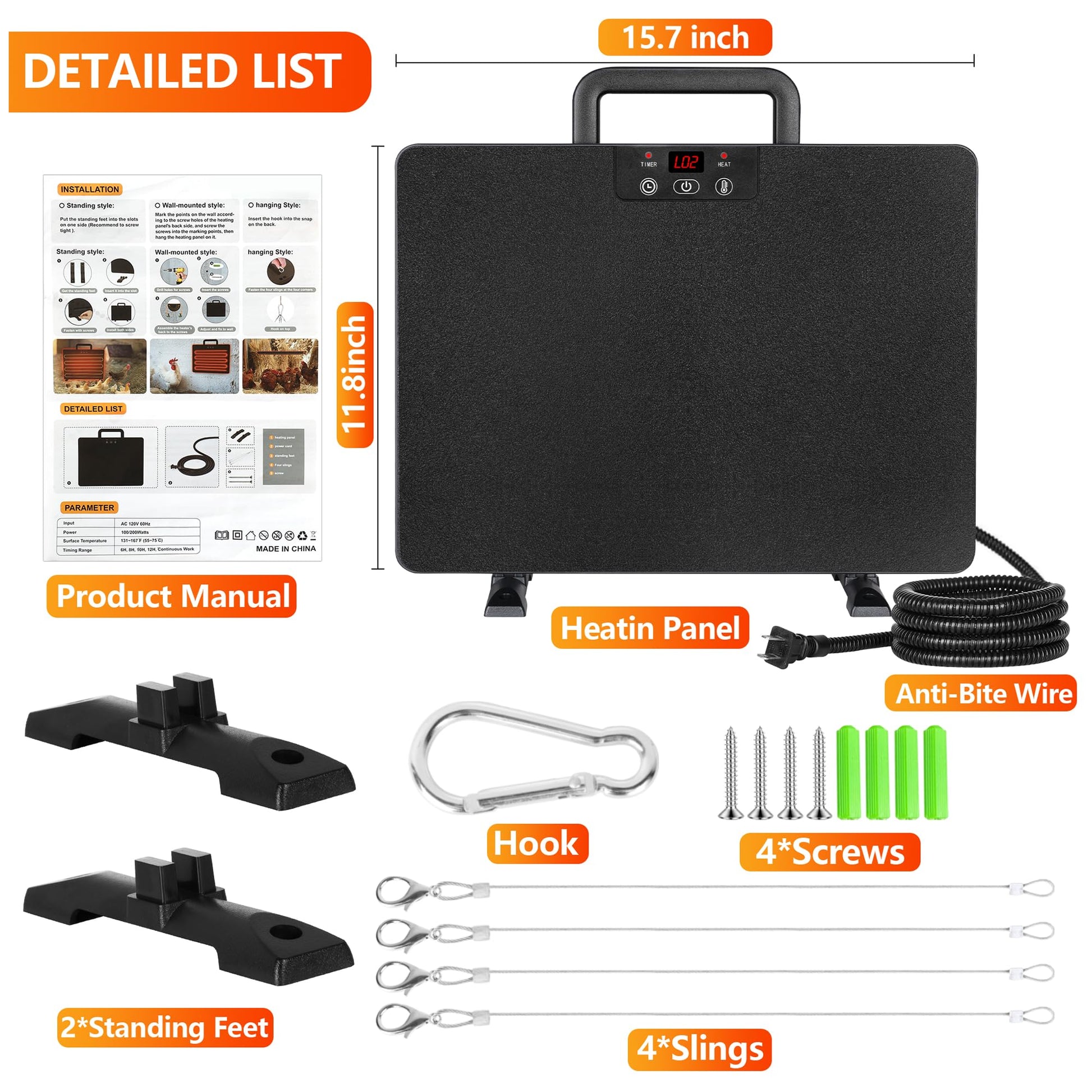 3 Mounting Options: The chicken coop heater comes with handle for easy movement, there are three other ways to install it, it can be stood on the ground, mounted on the wall, and can also be hung, the package also includes the required screws and slings.