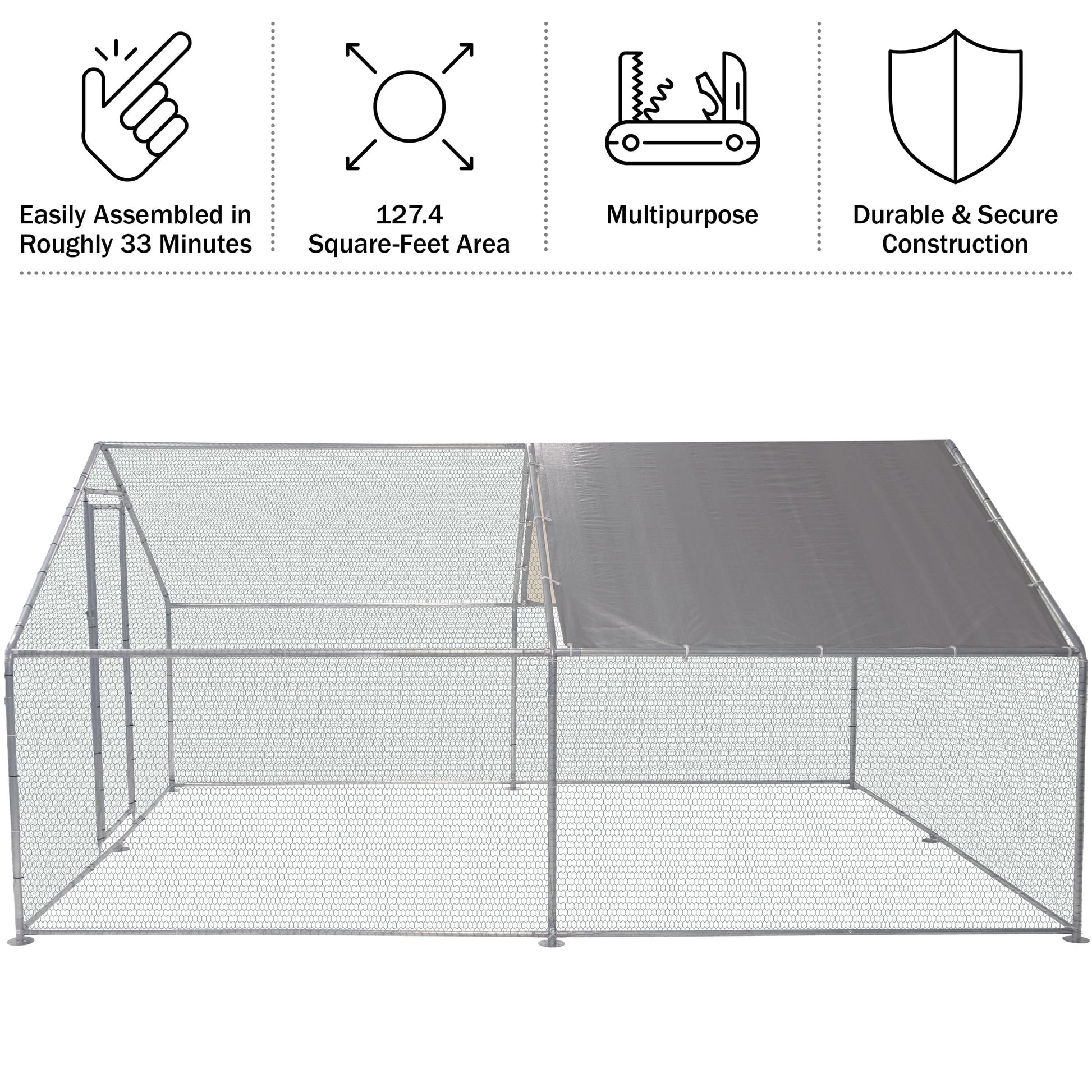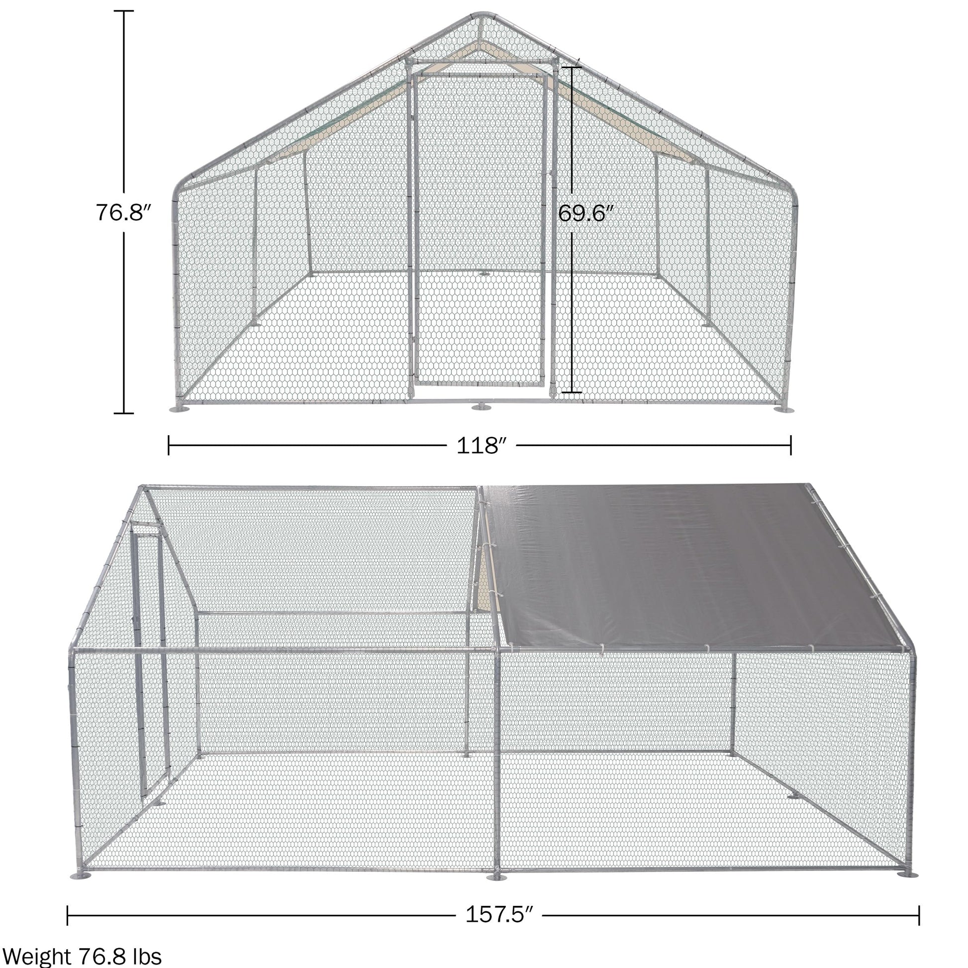 PRODUCT DETAILS - Materials: Alloy Steel, PE Cloth, and Nylon Mesh Wire. Dimensions: (L) 118” x (W) 157.5” x (H) 76.8”; Door: (H) 5.83’. Weight: 70lbs. Area: 127.4-Square-Feet. Comes with 16 Ground Nails. Color: Silver.