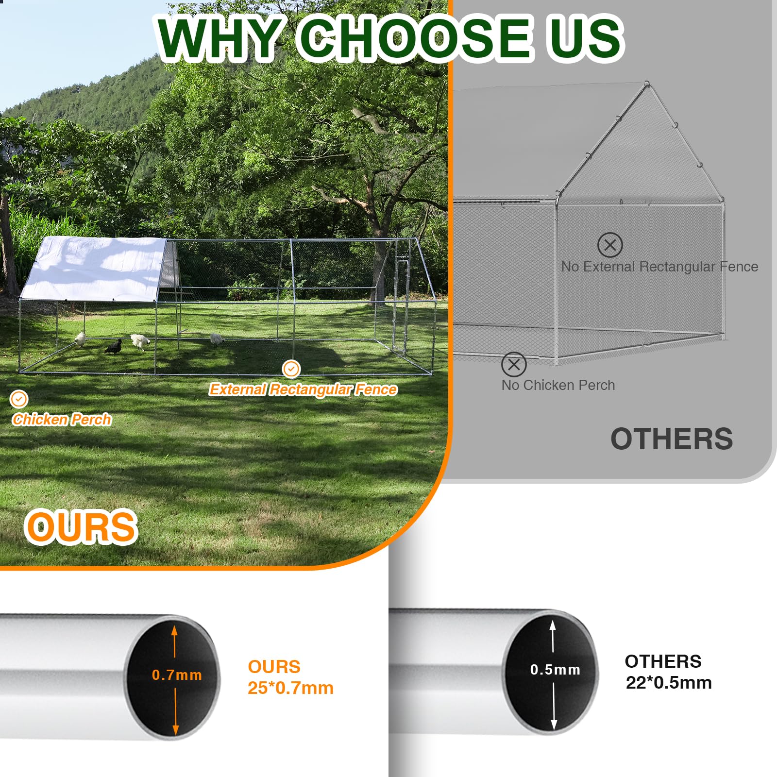 【Upgrade Rust-Proof & Durable Steel Structure】Chicken run is made of high quality galvanized frame and PVC protective mesh, so there is no need to worry about rust outdoors. Pipe thickness 0.7 mm, steel pipe diameter is thicker than most sold in the market, and can resist strong wind and rainfall, prolonging the service life of the coop. All frame corners on this chicken enclosure are well welded and ground to prevent sharp edges for safety.