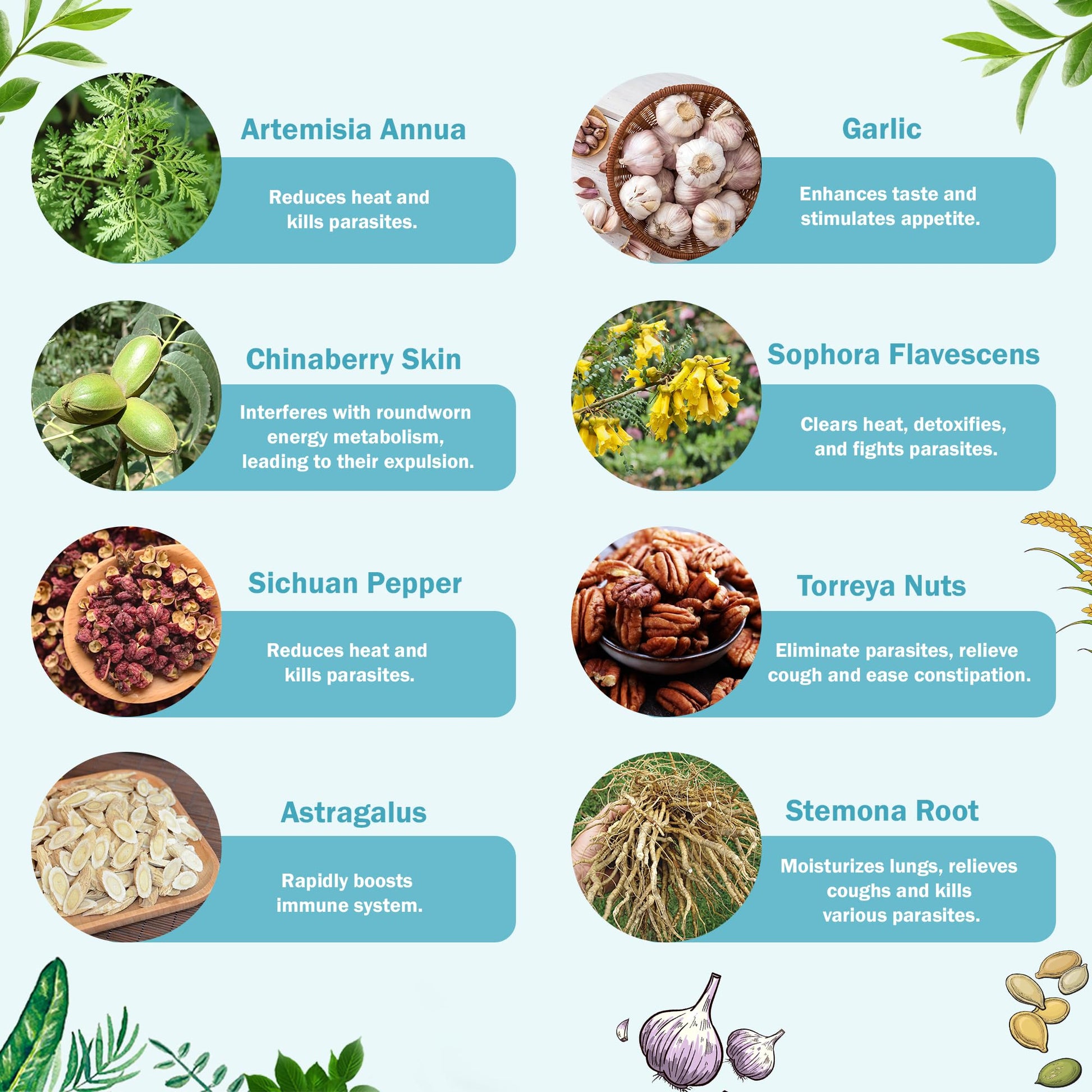 All-Natural Dewormer: Our formula contains garlic, artemisia annua, sophora flavescens, pumpkin seeds, stemona root, chinaberry skin, sichuan pepper, and astragalus torreya - providing a safe, simple deworming for your poultry