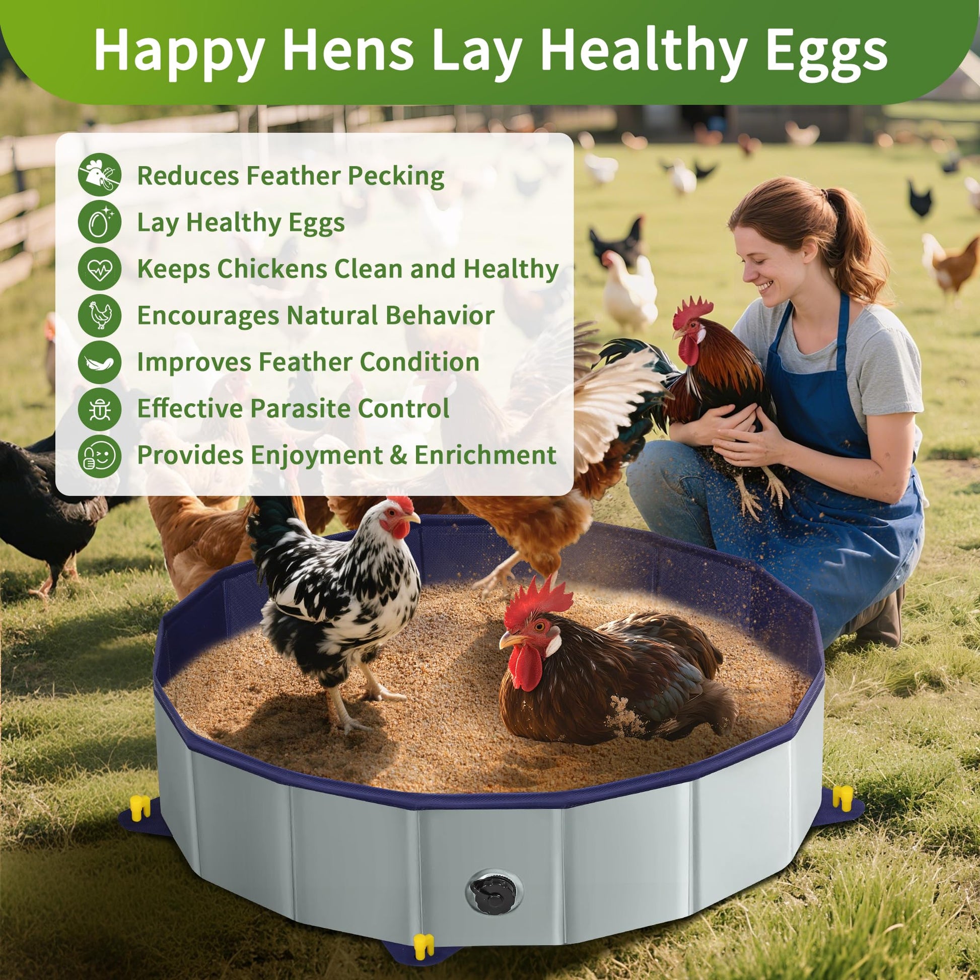 Game Changer: Foldable design with 32"D and 8"H - ready in Seconds, just unfold and add dust; It fits 3-5 chickens comfortably, giving them ample room to flap, roll, and kick up dust for a thorough cleaning session, helps prevent skin irritation; Time to give your flock a stable chicken bath containers in chicken house so they can rely on, keeping your flock healthy.