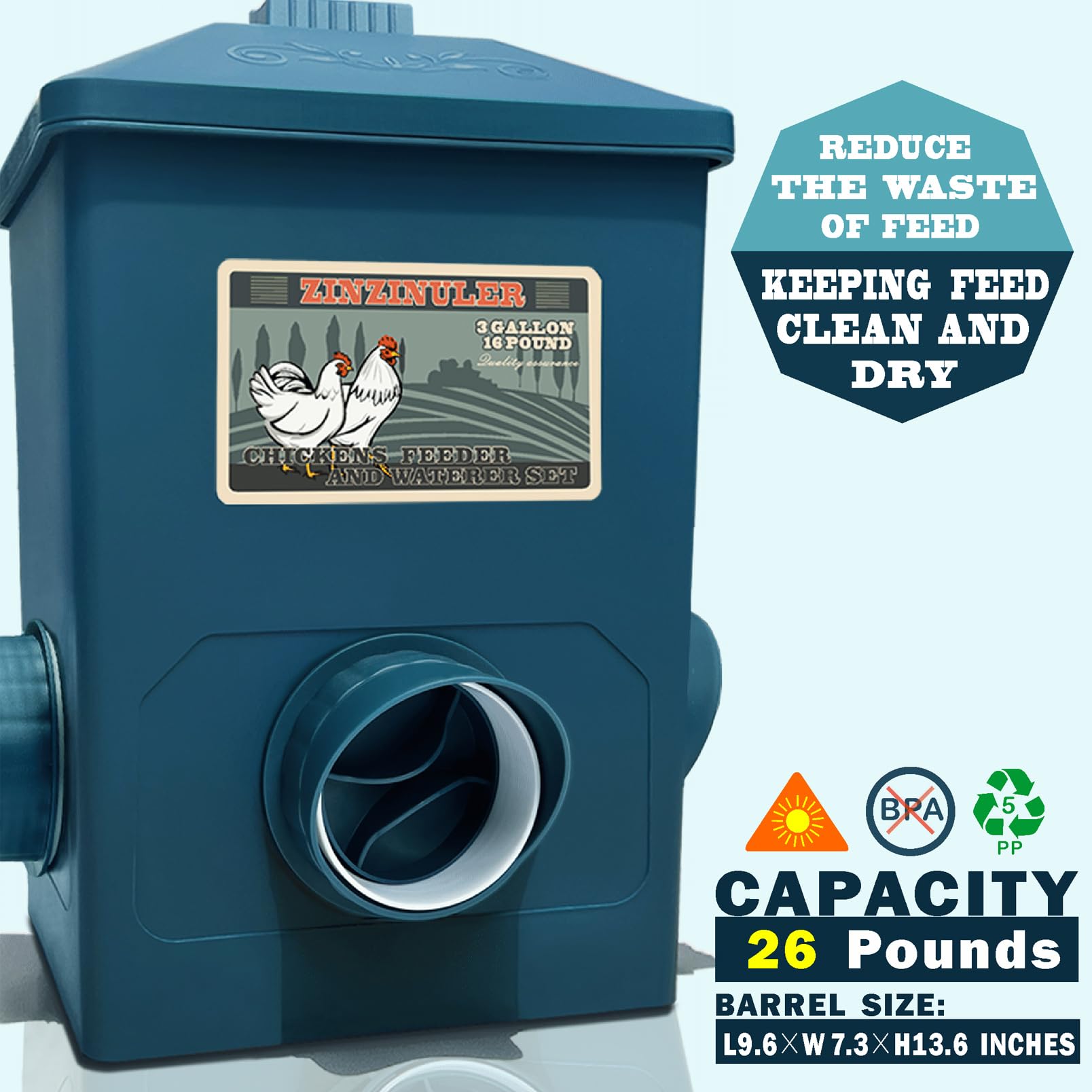 Chicken Supplies and Chicken Feeders - The chicken feeder features a secure lid to maintain feed hygiene. Its innovative port design significantly reduces waste by preventing chickens from scattering their feed, helping you save money. The wide-mouth opening accommodates even large roosters with prominent combs.