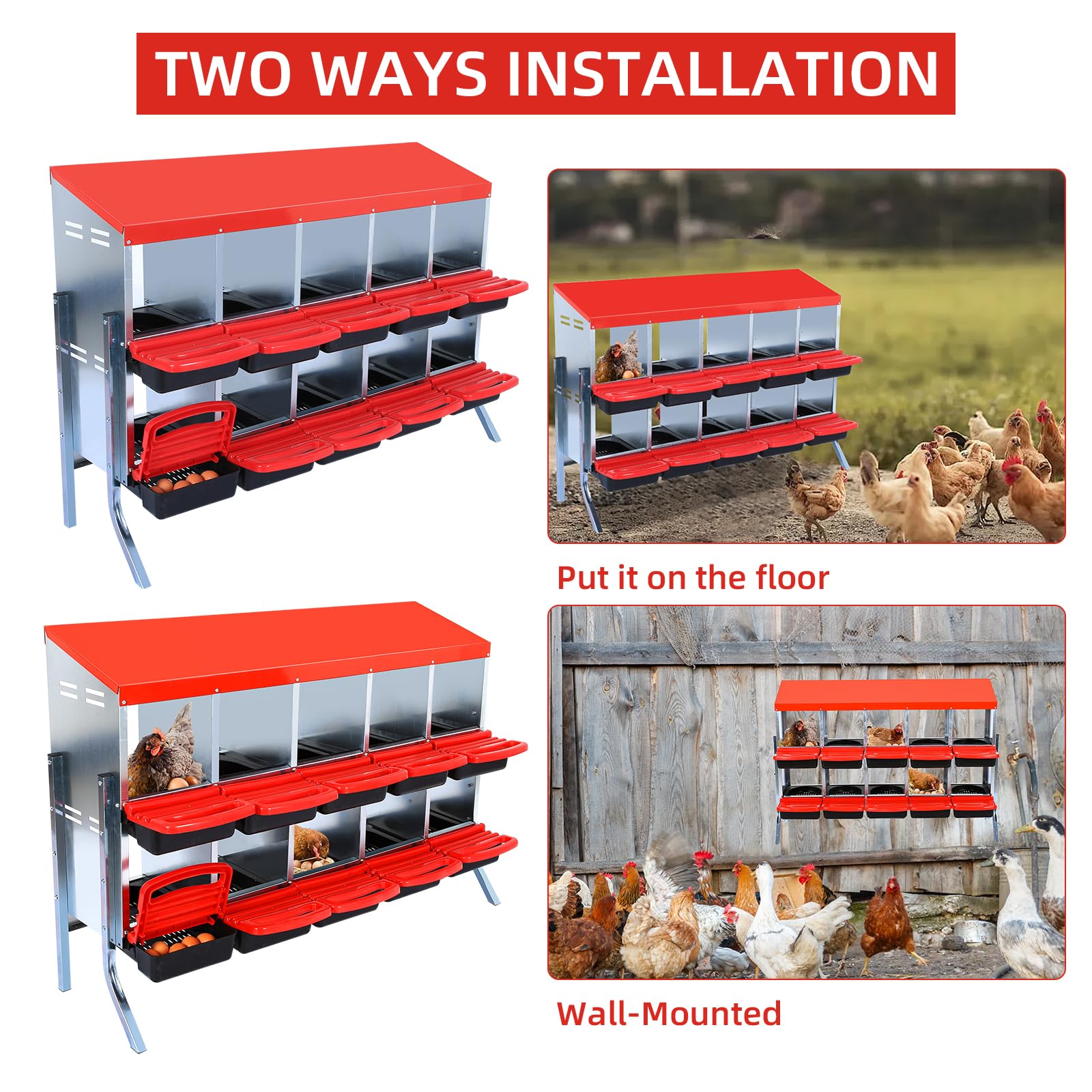 【Comfortable & Spacious】--Our metal chicken nesting boxes features 8/10 egg-laying compartments, providing ample room for your hens to comfortably lay their eggs. The spacious design ensures a stress-free environment, promoting higher egg production and healthier chickens. 2-Tier nesting boxes providing a secure and welcoming location, let your chickens comfortably produce eggs!