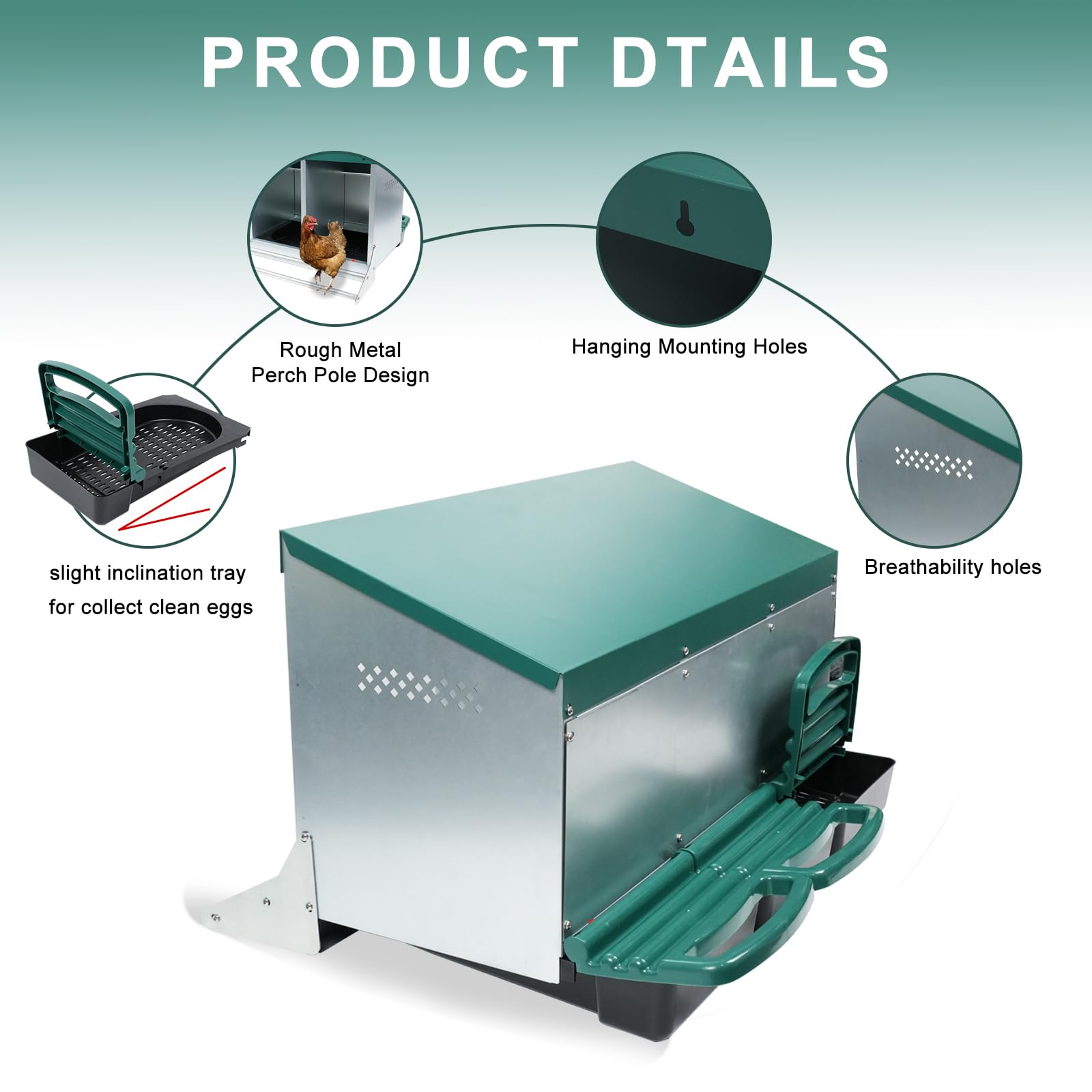【Auto Egg Collection】The slant laying trays for chicken nest box allows eggs to roll forward collection box with lid, keeping eggs safe until you're ready to collect, instead of the chickens eating them, and you don't have to into the chicken coop