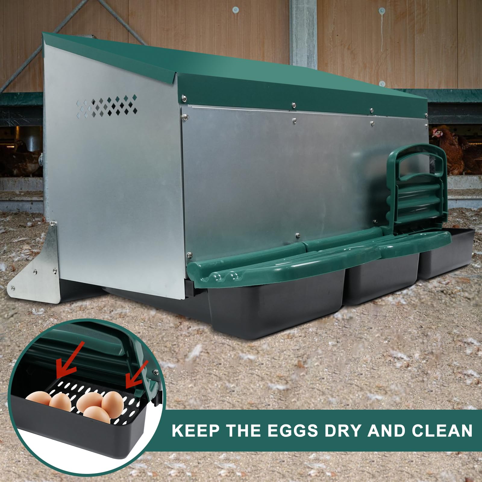 【Removable tray easy to clean】The eggs trays for chicken nesting box have small holes that allow debris to fall through,and trays can be removed for easy cleaning. Just lift the metal egg-laying box above the non-slip clips, and pull out the plastic tray, Simply rinse with a garden hose to keep chicken nesting box clean and provide a hygienic egg-laying environment for your hens