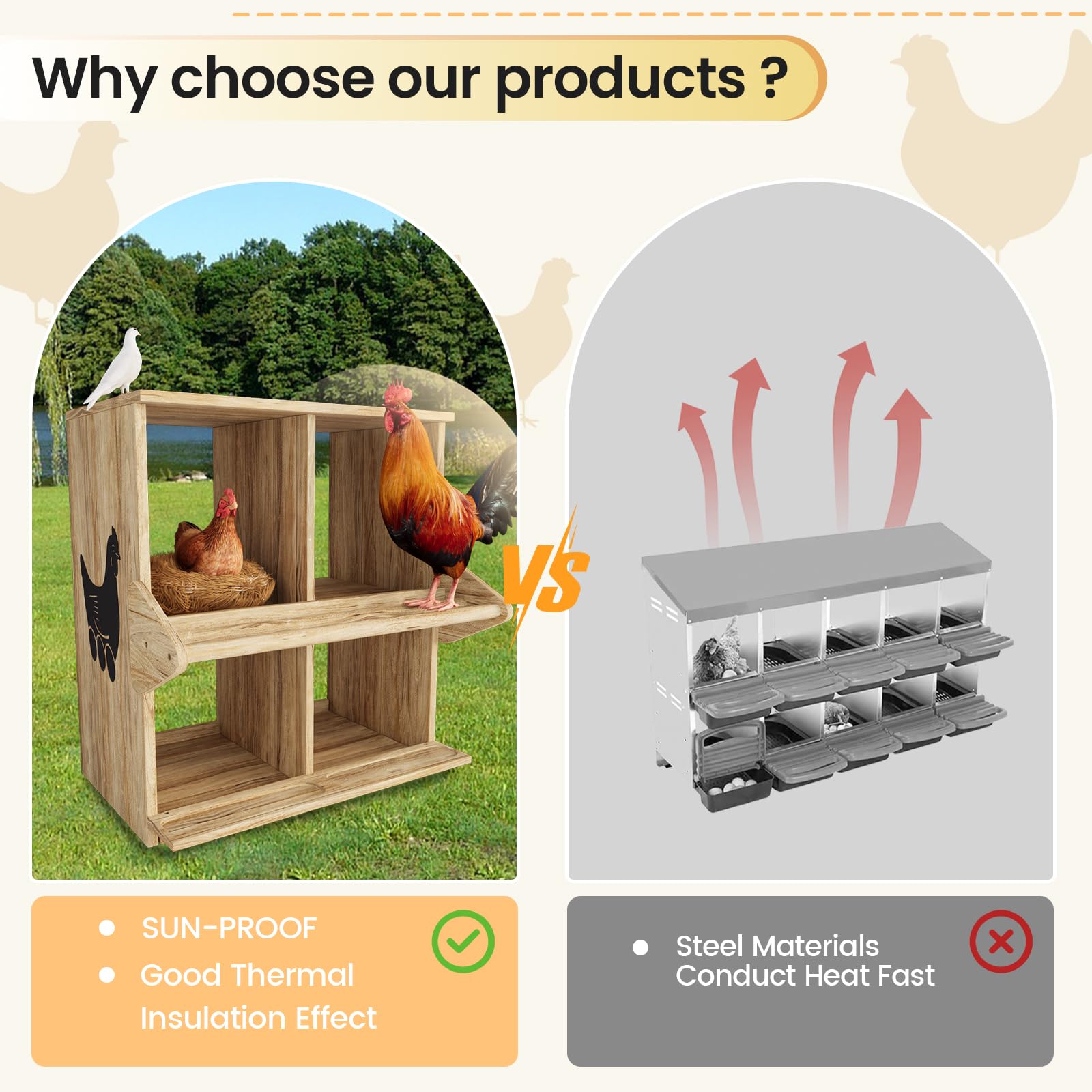 Natural Solid Wood Nesting Box: Crafted from durable wood to mimic hens' natural habitat, reducing stress. Waterproof, durable, and easy to clean, it offers a safe, insulated space for egg-laying and ensures long-lasting