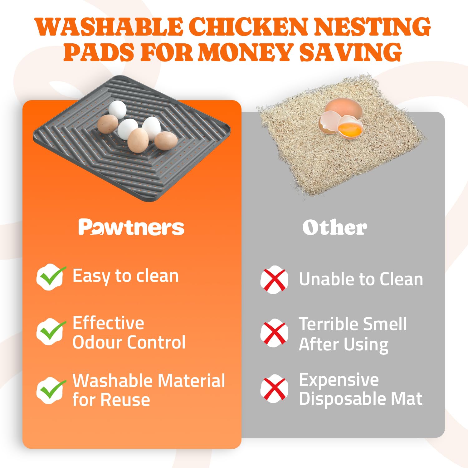 Easy Cleaning Chicken Laying Pads: Pawtners nest box pads offer a more hygienic environment for your chickens and eggs. The nesting mats are easy to install and remove, making the cleaning and maintenance process very easy. The perfect chicken accessories for your coop